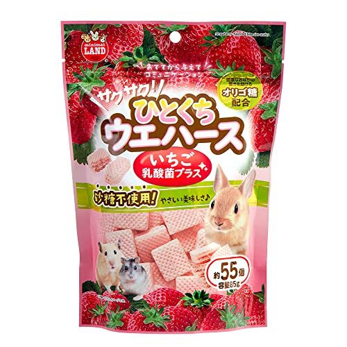 「ミニマルランド サクサクひとくちウエハース いちご 乳酸菌プラス 85g」▼4906456578017▼(商品説明)ウエハース-/85g (x 1)/ML-472・パッケージ個数:1・オリゴ糖、乳酸菌配合砂糖不使用のいちご味のウエハース商品紹介 オリゴ糖、乳酸菌配合。砂糖不使用のいちご味のウエハースです。 原材料・成分 粗たん白質:11.0%以上、粗脂肪:9.1%以上、粗繊維:6.0%以下、粗灰分:1.2%以下、水分:10.0%以下 使用方法 本品はうさぎ、モルモット、ハムスターなどの小動物用です。対象以外には与えないでください。
