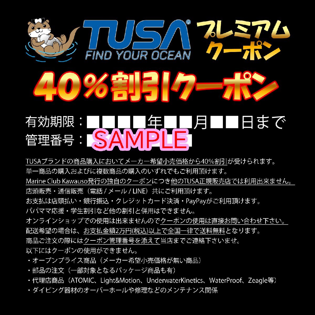 | 商品の製造時の原因による欠陥や不良などは、無償修理を受け付けさせて頂きます。 商品到着後、可能な限り7日間以内に下記よりご連絡ください。 📧yahoo@marine-club-kawauso.net 📞049-243-9411 [公式LINE] https://page.line.me/848jwysn?openQrModal=true |