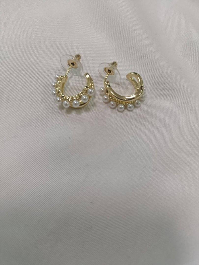 ・繊細なパール風が連なったカフと、シンプルなフープの組み合わせが、上品で洗練された印象を与えます。