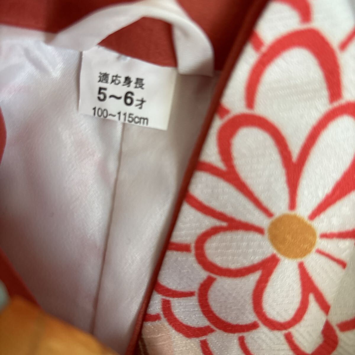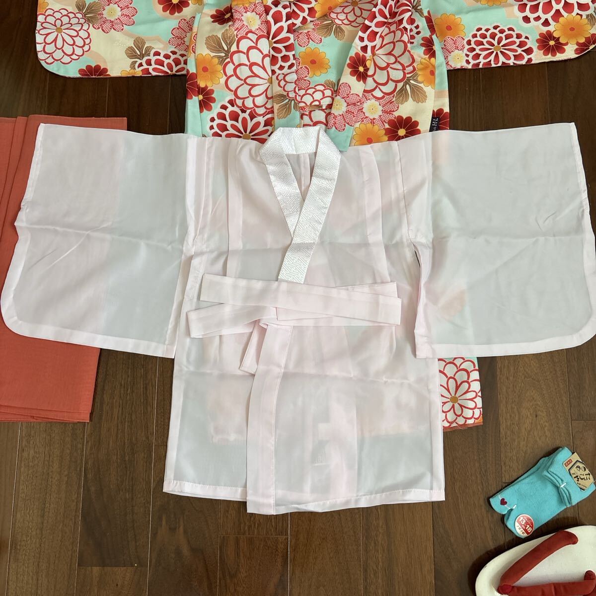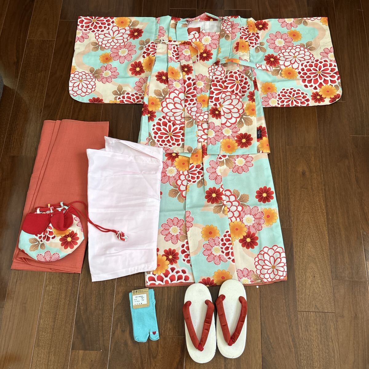鮮やかな水色とピンクの花柄の着物セット、5〜6才用。