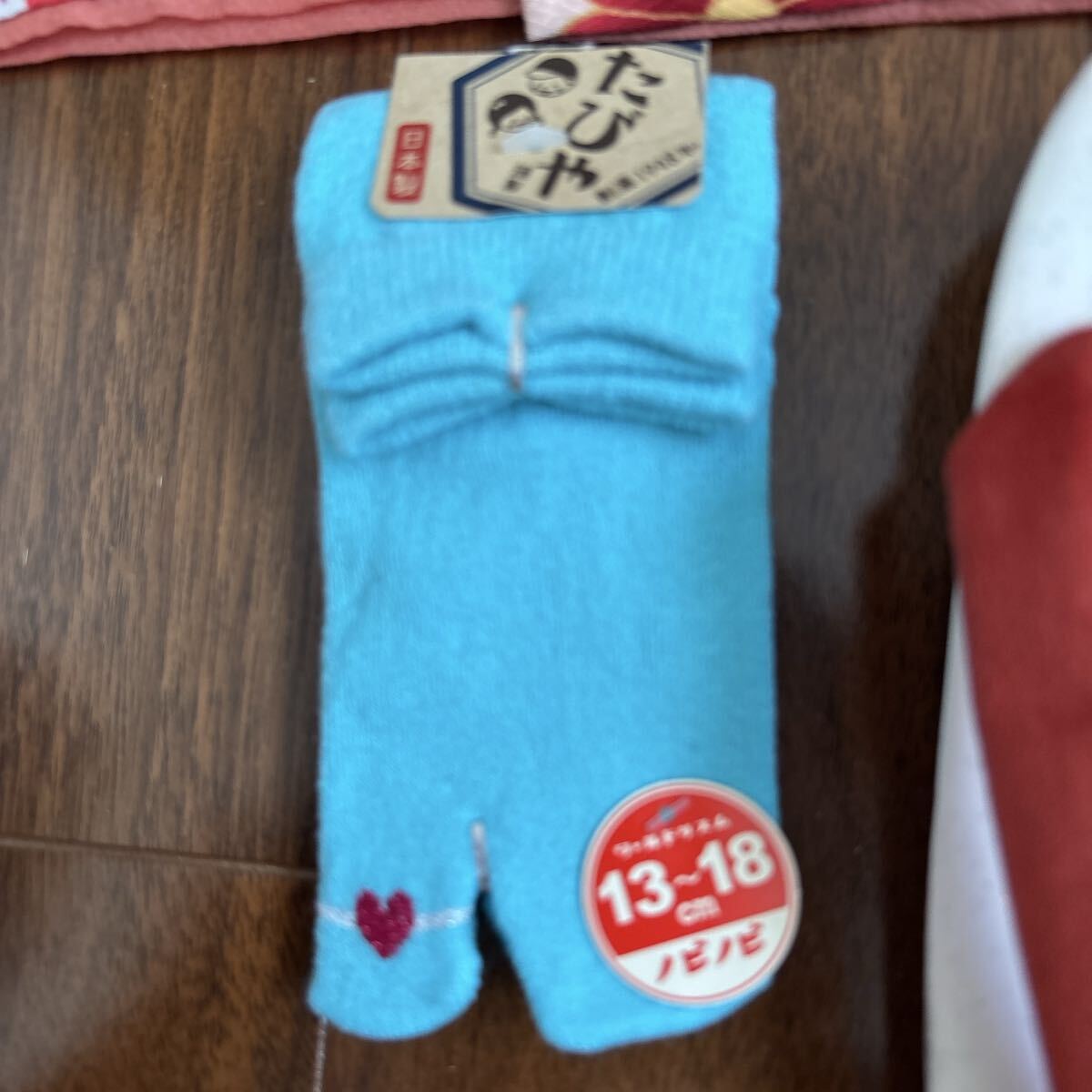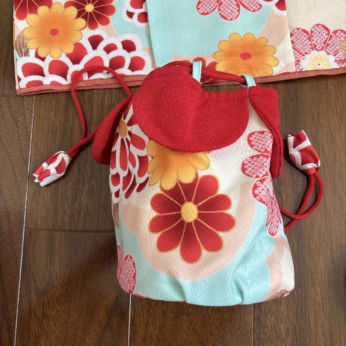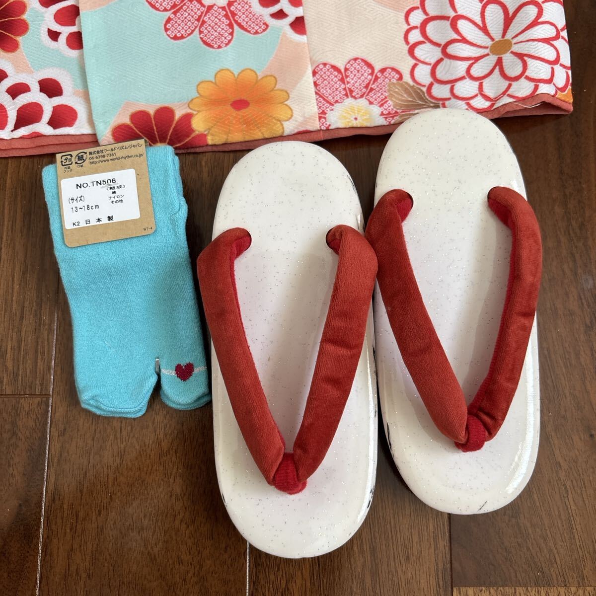 鮮やかな水色とピンクの花柄の着物セット、5〜6才用。