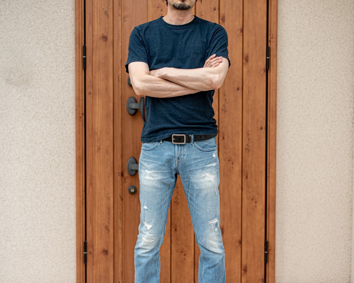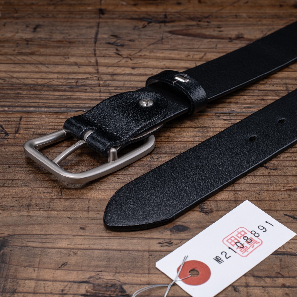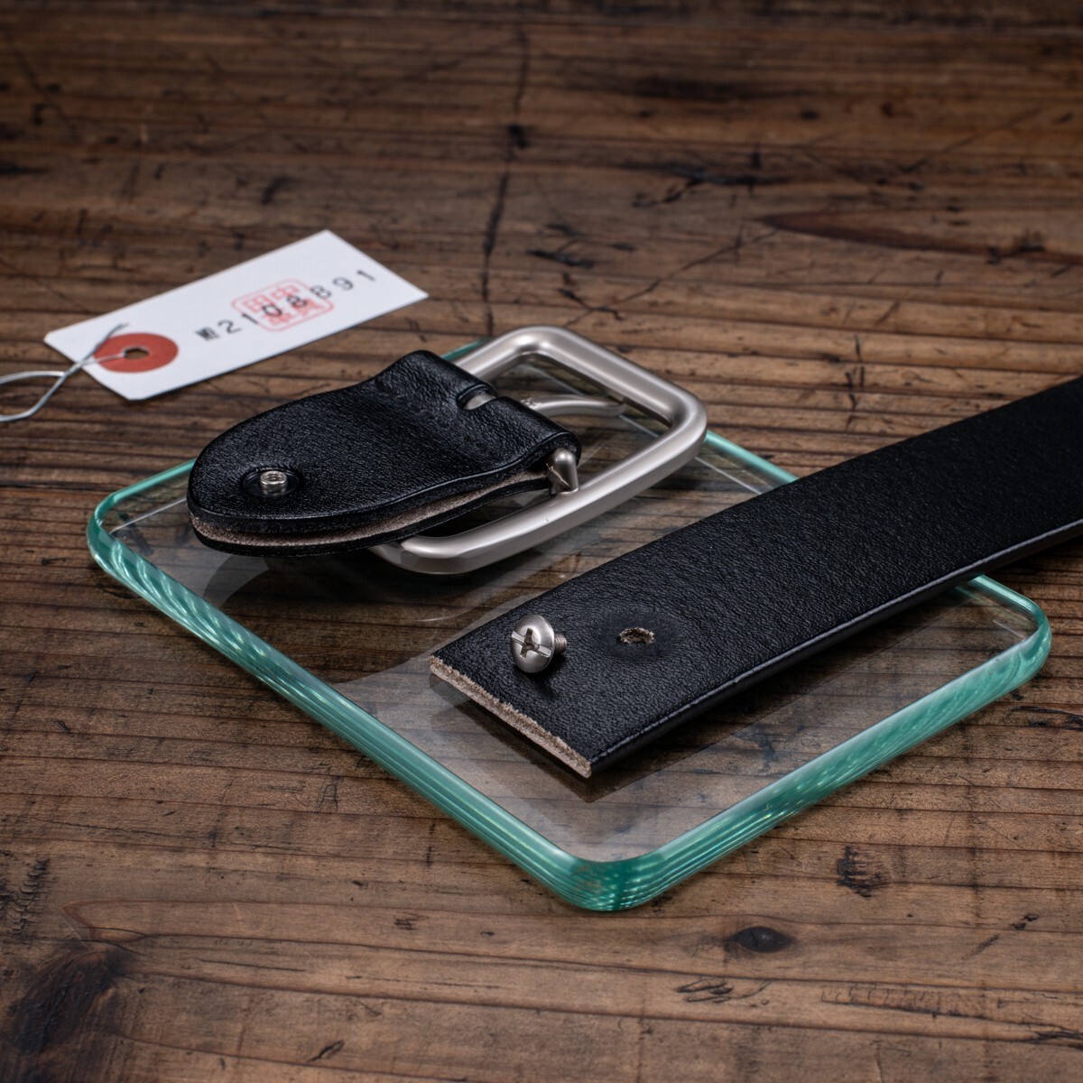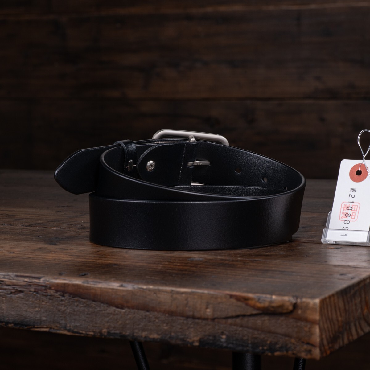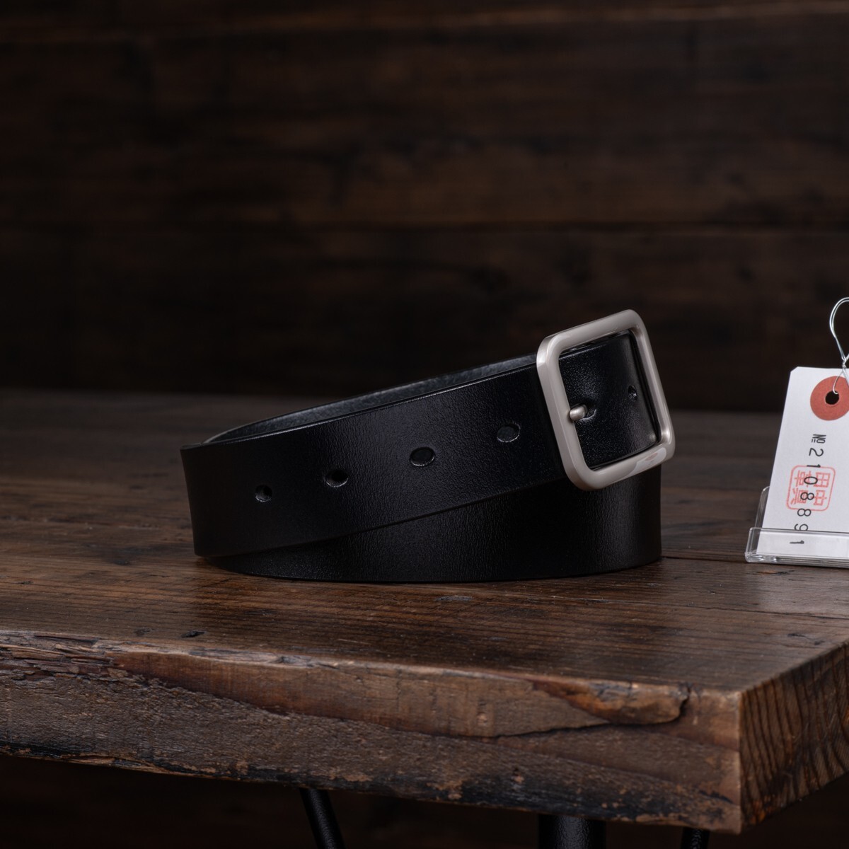 イタリアンレザーのフルグレインを使った一枚革のベルトです。革の貼り合わせをしていないため芯まで同じ革で仕立てられており、しなやかでクセがなく、柔らかな手触りで使いやすい仕上がりになっています。断面(コバ)は丁寧に磨かれて滑らかに仕上げられ、裏面も床磨きによってさらりとした手触りになっているため、ベルト通しもスムーズです。