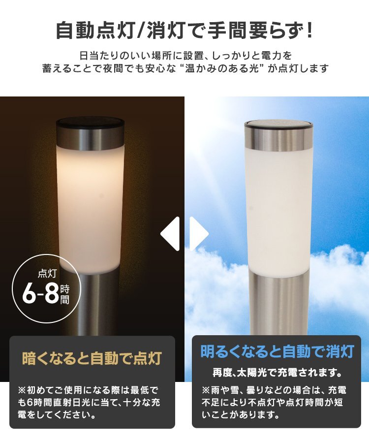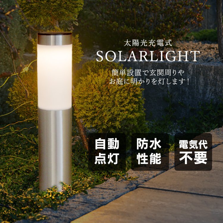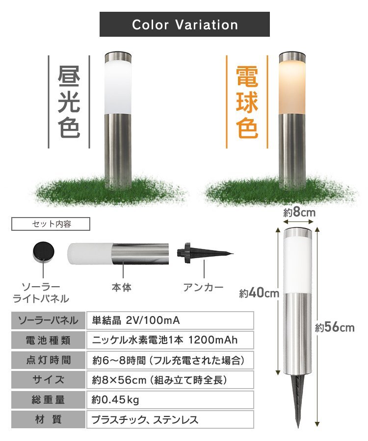 お庭や玄関先などに最適なLEDソーラーライトです。 地面に差すだけとセッティングもカンタン。 暗くなったら自動点灯、明るくなったら自動消灯。 ソーラーパネルが日中太陽の光で充電し、夕暮れになると自動的に点灯します。 お手軽カンタンに、自宅のお庭を彩ります。 付属品のアンカーを地中に埋め込んで固定し、玄関までの通路や庭先までのアプローチ部分にやさしい明かりを灯して下さい。 ガーデニング照明にも最適! 【商品内容】 ・本体 ×4 ・ソーラーパネルライト ×4 ・アンカー ×4 【商品詳細】 発光色:電球色、昼光色 サイズ ・直径:(約)8cm ・ソーラーライト本体:(約)40cm ・全高:(約)56cm 重量:(約)450g 光源:LED 電池:ニッケル水素電池1本 1200mAh 点灯時間:(約)6~8時間 ※直射日光が6時間以上あたる場所に設置した場合 素材:プラスチック、ステンレス |