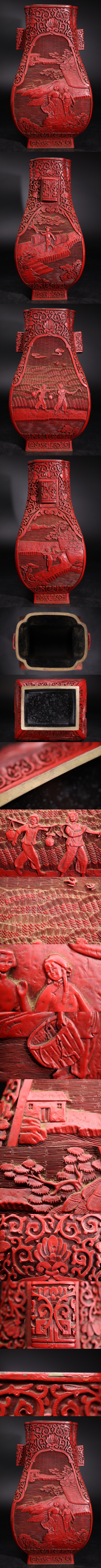 | 時代 堆朱 人物文 双耳 花瓶 / 漆芸 漆器 中国美術 花器 壺 煎茶飾 .G2410 |