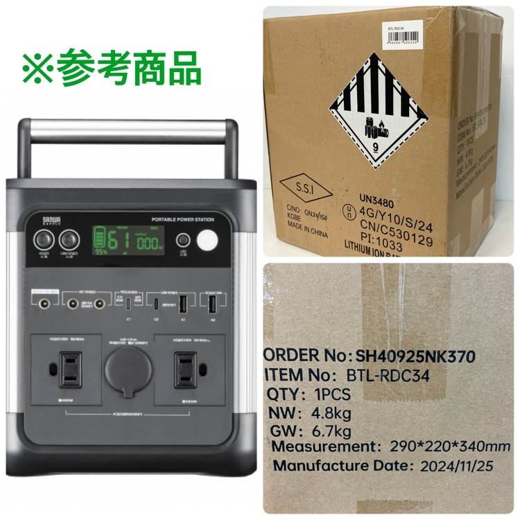 | 規格・仕様 | セット内容:本体、専用ACアダプタ、AC電源コード、シガープラグアダプタ、ソーラー充電ケーブル、取扱説明書 【使用目安(参考)】 ノートPC(14インチ):約8~10時間 スマートフォン:最大25~50回充電 モバイルWi?Fiルーター:約50時間連続稼働 USB・AC・DC出力対応。キャンプや災害時にも便利! |