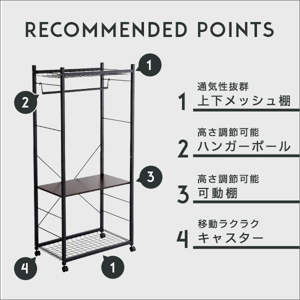 【ポイント】 木の温かみとブラックスチールの美しいコントラストが映えるデザインハンガーラックです。 お部屋にお洒落なアクセントが欲しい、衣類の収納にこだわる方へ特にオススメです。 通気性抜群上下メッシュ棚・高さ調節可能ハンガーポール 可動棚・移動楽々ストッパーキャスター付き。 ポールと棚板は簡単に外せて自由に付け替え可能です。 高さ調節可能なので子供部屋からおしゃれリビングまで 自由自在に使えます。 |