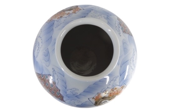 白磁に鮮やかな赤絵と金彩を施し、扇面の中に松竹梅を描いた華やかな花瓶です。