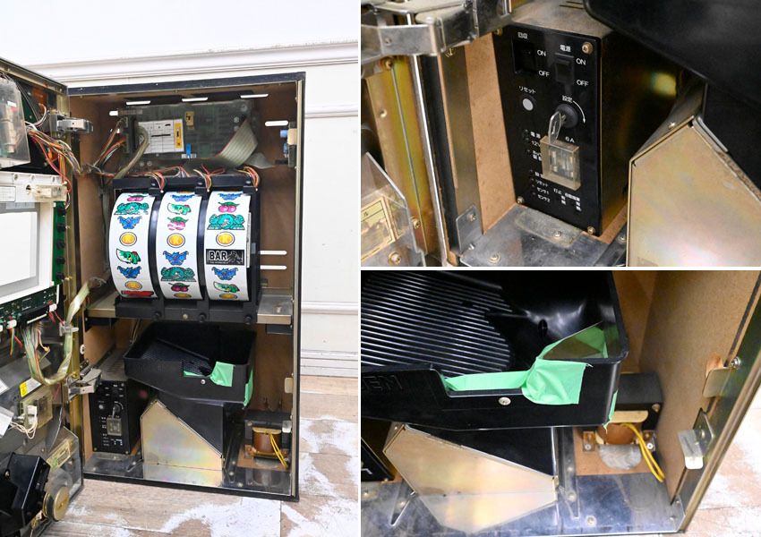 ----------------------------------------------------------------------------------------- ●送料や注意事項は必ずご確認下さい。落札後にトラブルになるケースが増えております。● ◆コンディションは写真・文章にて記載して有りますが、全てのキズの写真は掲載致しておりません。大きなダメージを除き見落とし、記載漏れが有る事はご了承下さい。 ◆当サイトにて出品する商品は多種多彩で、当方商品知識の無い物も多数ありますので落札後の質問やメンテナンス等にはお答えできません。 ◆入札された時点で、画像、文章をご理解していただいたものと判断させていただきます。不明な点は前もってQ&Aからお願い致します。入札後の質問やお電話等でのキャンセルは一切受け付け致しません。 ◆商品説明に「ノークレーム」と記載しているものに関しては、如何なる状況で届いても保証致しません。詳しくは注意事項の「商品到着後について」の最後に記載しておりますのでご確認下さい。 ---------------------------------------------------------------------------------------- 使用キズ、汚れ等有ります。 鍵は有りませんのでドアの横の穴から開けてください。 内部の緑テープはコインが溢れないように付けているみたいです。 コイン投入部内側パーツ無い所有りますが動作はします。 コインは有りません。 幅47.5 奥38 高81cm 簡単な動作は問題有りません。 長時間の検査は致していない事、この手の商品不具合が起きやすい事などを考慮し、こちらのお品は運送事故も含めノークレームノーリターンでの出品となります。 運送保険も入りませんので、業者補償もありません。予めご了承下さい。 落札前の動作確認も可能ですので質問か自己紹介からご連絡いただければ対応させて頂きます。但し事前予約必要です。急な訪問には対応出来ませんのでご注意下さい。  | ||