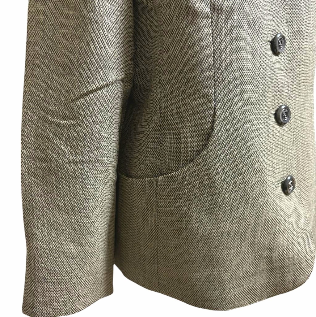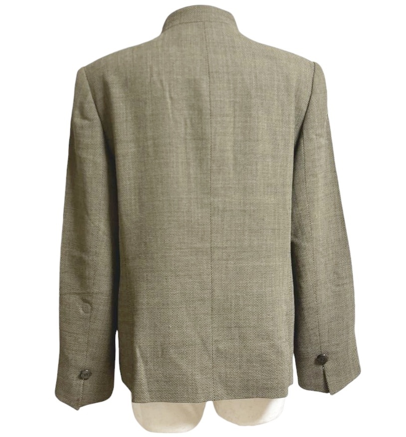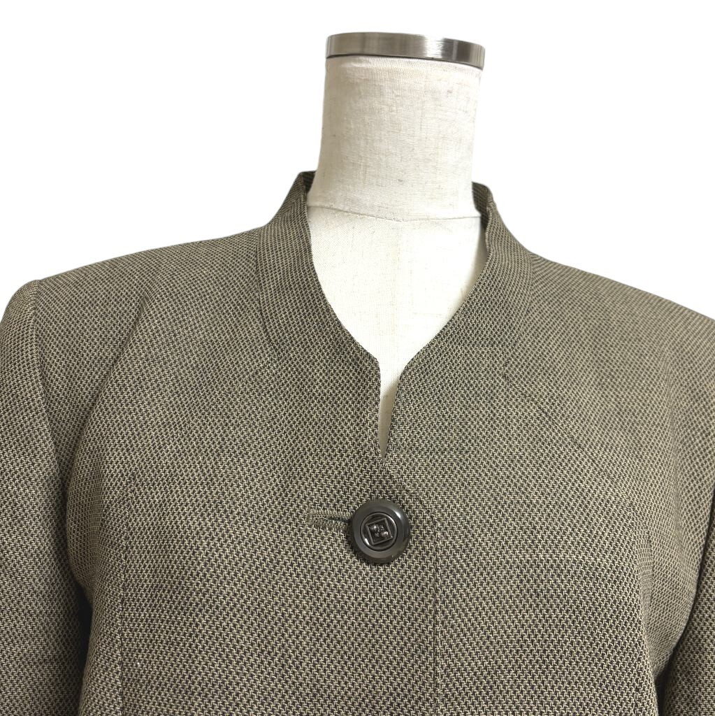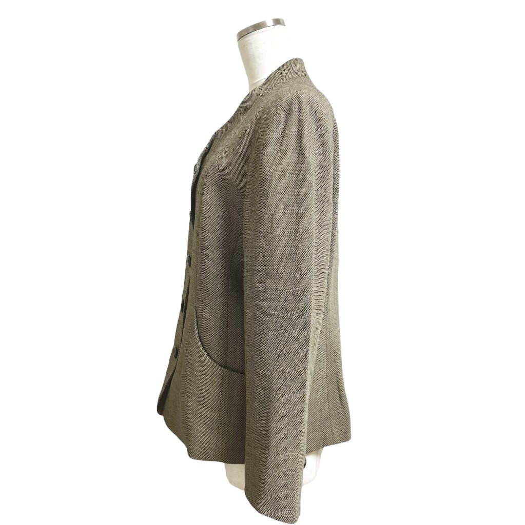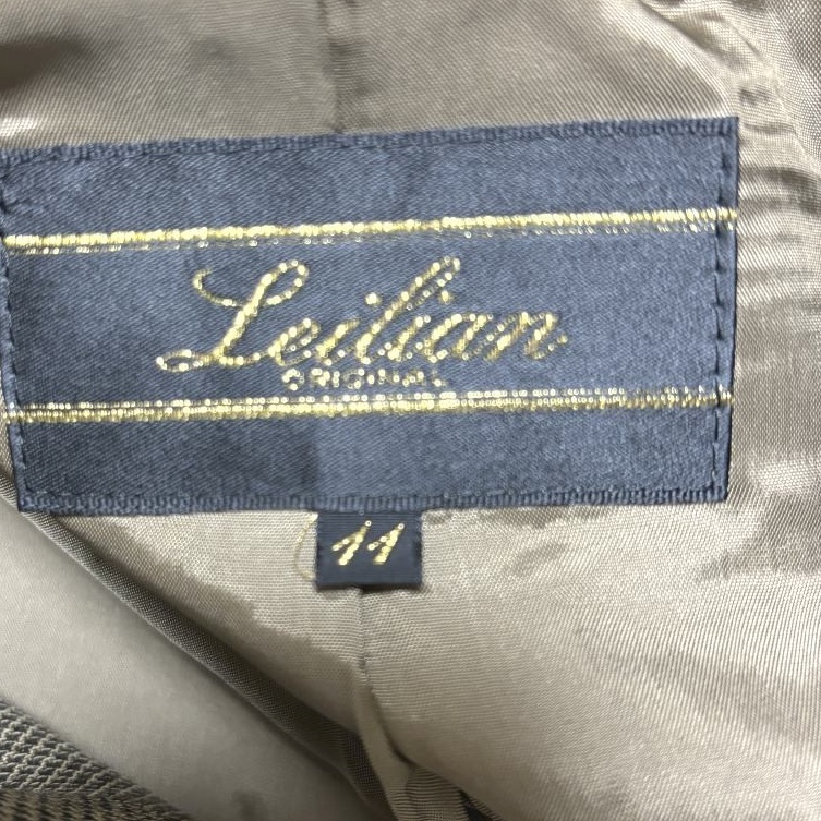 使用感目立ちません。Leilian(レリアン)の大きいサイズレディース用マオカラージャケットです。サイズは11号(L)で、落ち着いたモスグリーンが魅力的な一着です。マオカラー(スタンドカラー)が首元をすっきりと見せ、クラシカルで上品な印象を与えてくれます。上質な素材を使用しており、しっかりとした仕立てでシルエットも美しく、フォーマルからカジュアルまで幅広く対応。状態は非常に良好で、目立つ使用感はなく、汚れや傷も見当たりません。上品でシックなデザインが、日常のおしゃれに一層の洗練をもたらす美品です。春、秋に。 ポケットあり。裏地あり。肩パッドあり。◆サイズ◆11号 肩幅40 バスト102 袖丈55 そで幅18 着丈60 ◆素材◆画像参照
