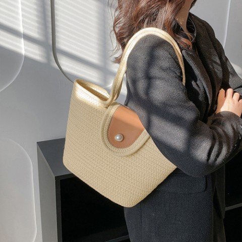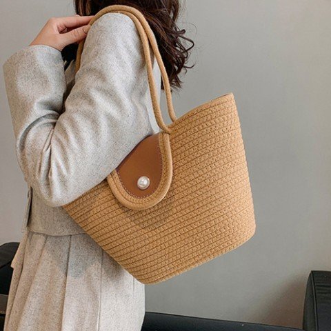 レディース カジュアル ストローバッグ 大人可愛い サマーバケツバッグ おしゃれ 麦わらバッグ 肩掛け 編みバッグ韓国