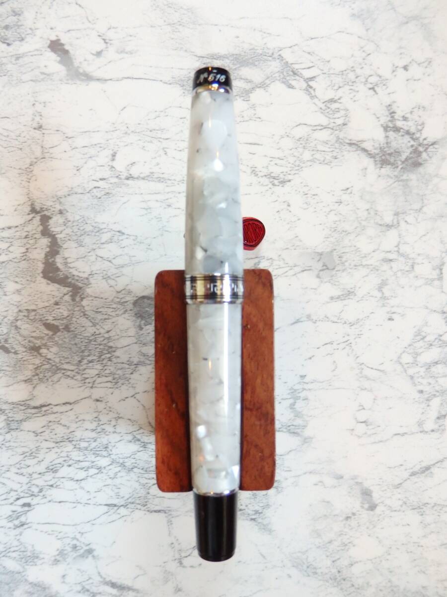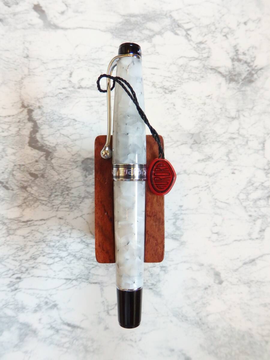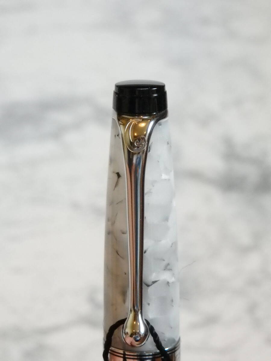 この優雅で上品な色合いのキャップと胴軸の素材は、地上に降り注ぐ月の光の神秘さと優しさを表現するホワイト・マーブル・レジンが使用され、ジュエリークリップには,月がシンボライズされて刻印されています。