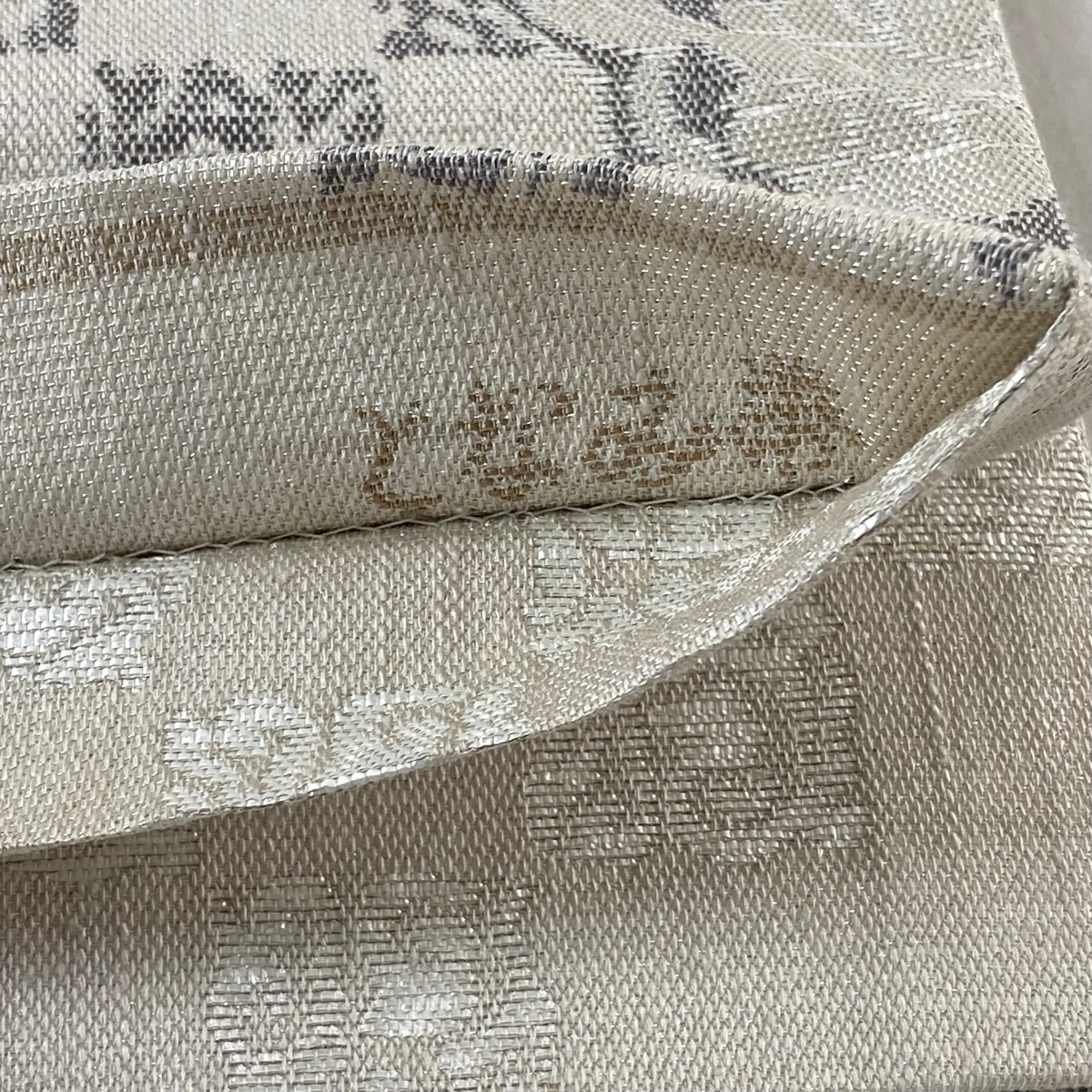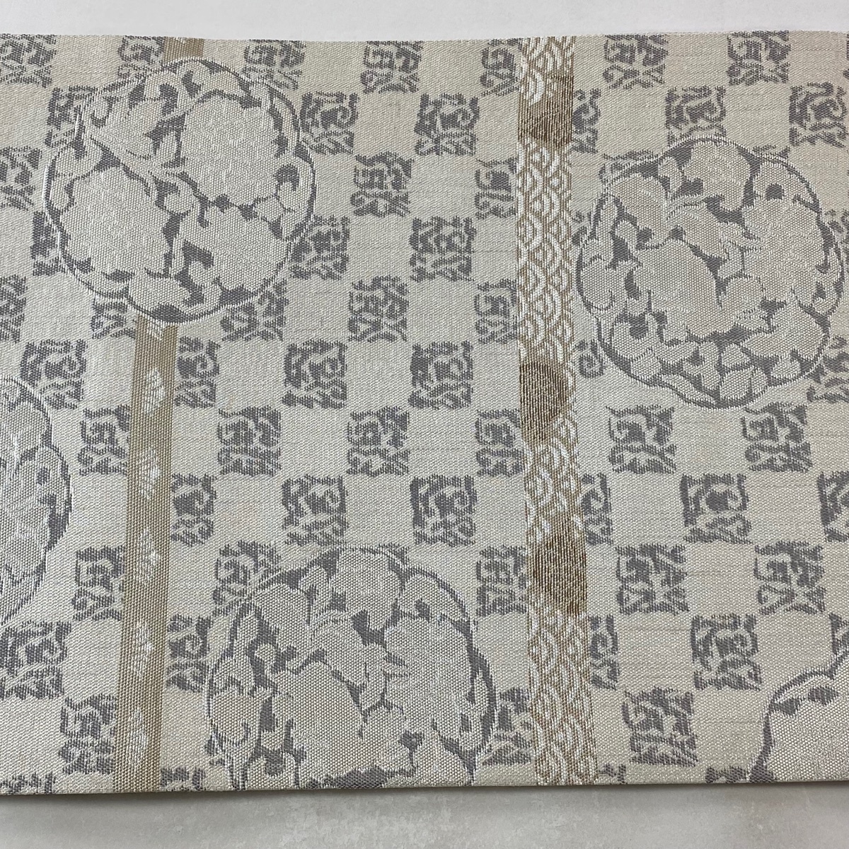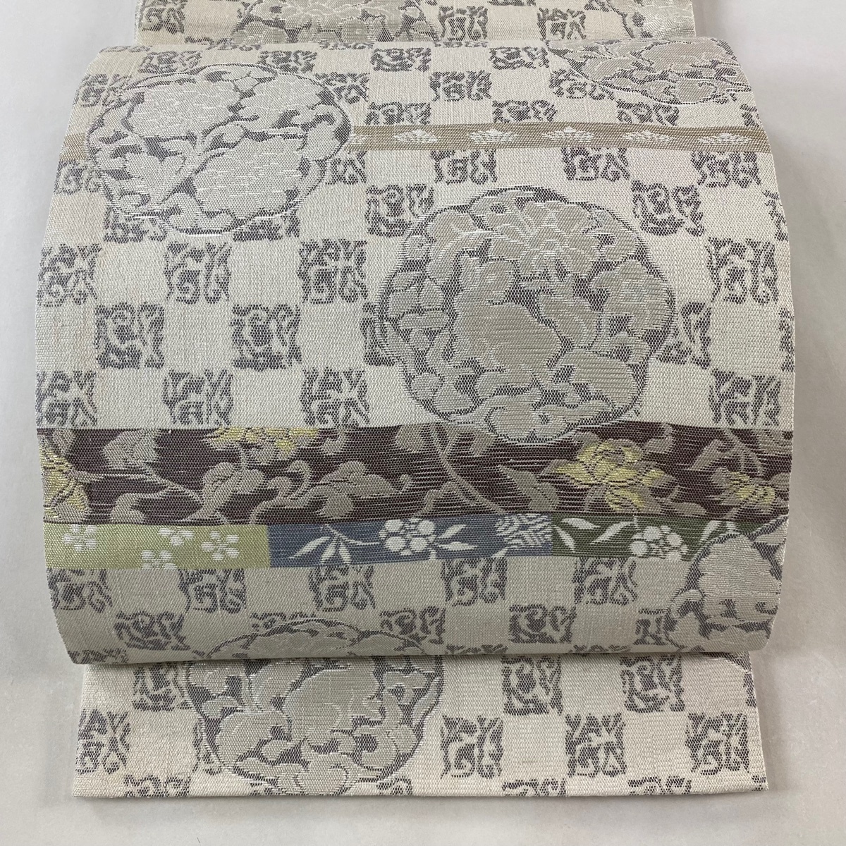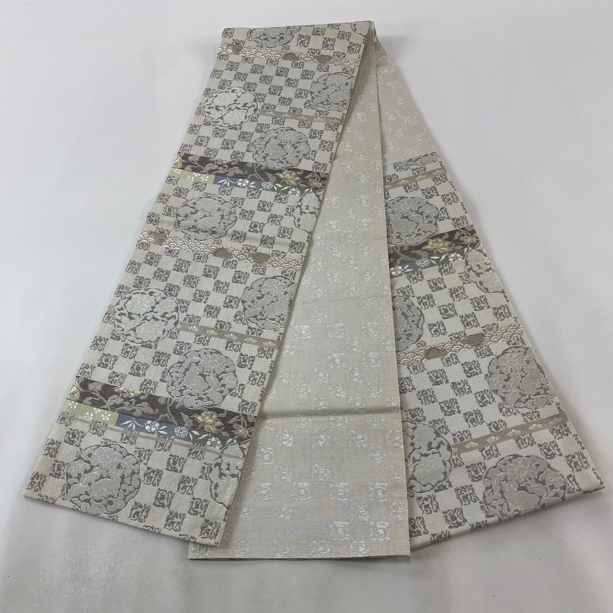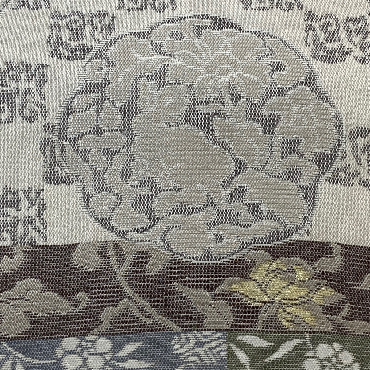 | 袋帯 名品 となみ織物 落款 花うさぎ 変わり市松 銀糸 箔 灰白 六通 正絹 【中古】 |