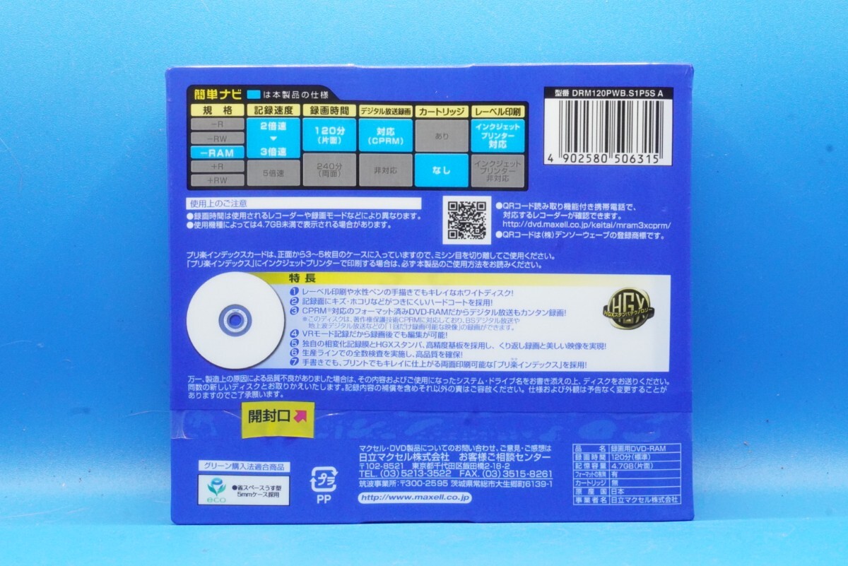 録画用DVD-RAM maxell(マクセル) 3倍速 120分 4.7GB 5枚パック DRM120PWB.S1P5S A 未使用,未開封品です。