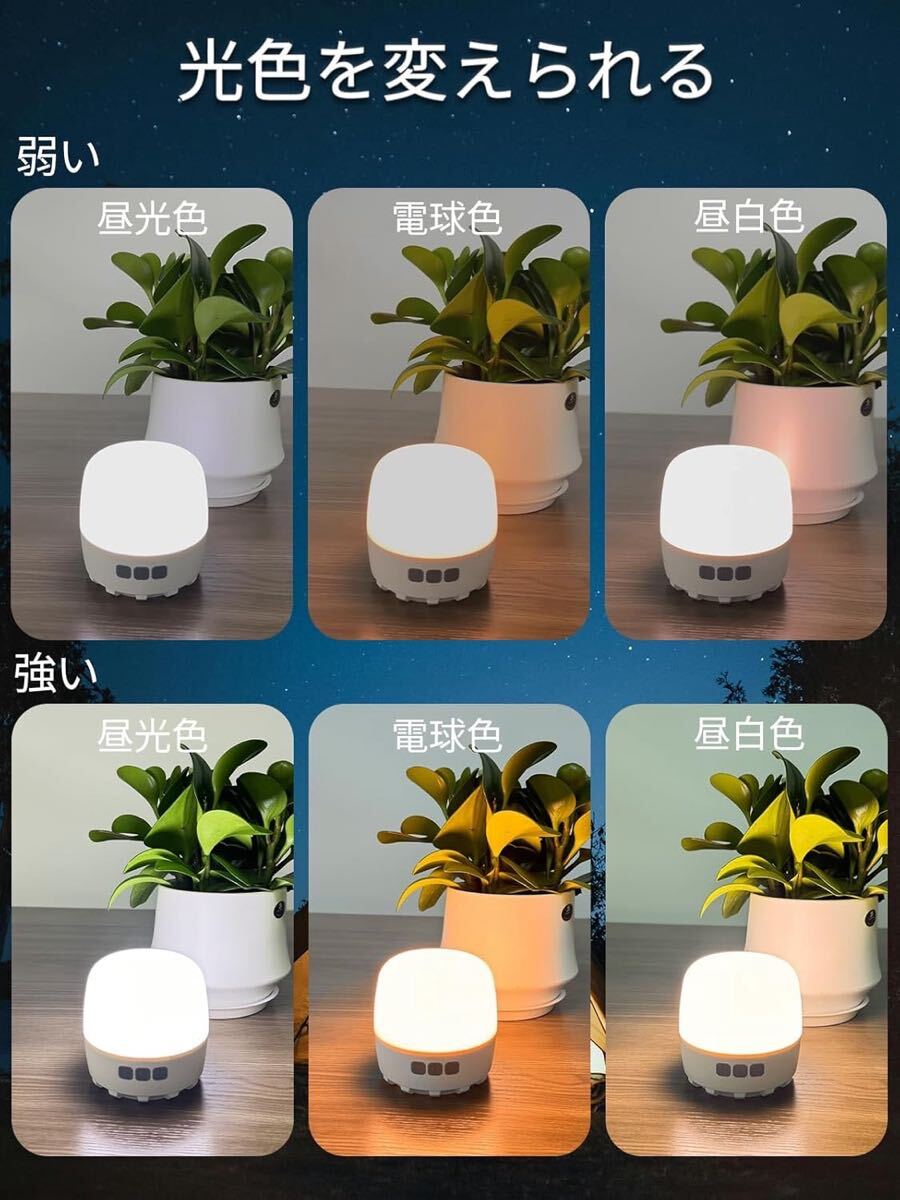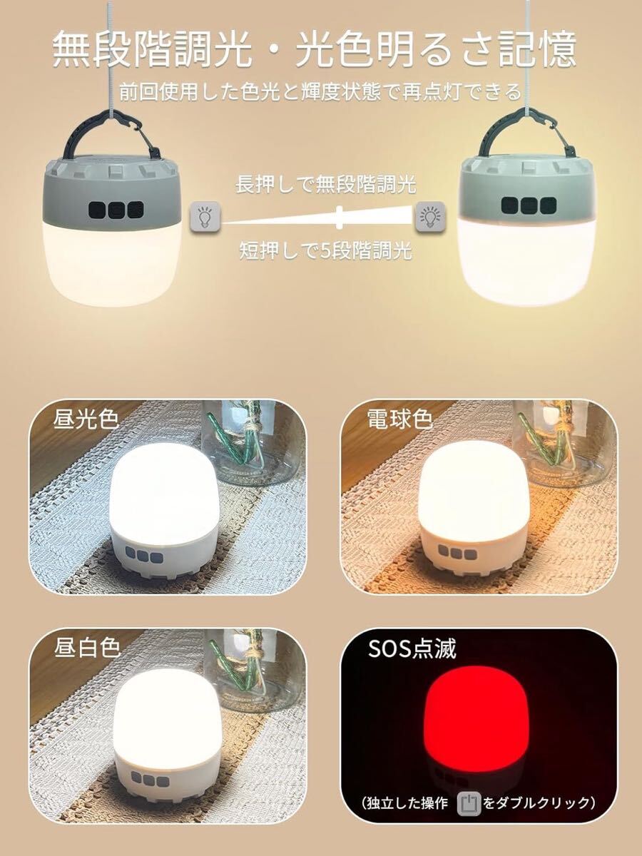 色温度は3500K-7500K調節可能で、LEDライトの光色は昼光色、電球色、昼白色、SOSライトの4種類。白っぽく青みがかった色が特徴のもっとも明るい「昼光色」、オレンジっぽく暖かみのある暖色系の「電球色」、もっとも自然な光の色に近いと言われる「昼白色」があり、テーブルやベッドサイド、屋外、車中泊など、好みやシーンにあわせて切替