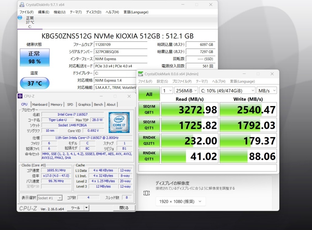 | CPU: 超高速 Intel 卓越性能 第11世代Core i7-1165G7 2.8Ghz、 4コア8スレッド (ターボ・ブースト利用時の最大周波数 4.7GHz) |