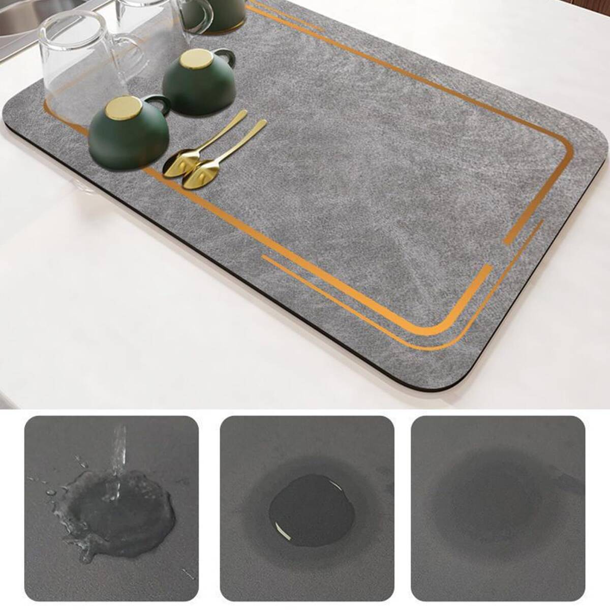 【水切りマット】素材:表面:PUレザー、中材:珪藻土、裏材:ゴム。珪藻土が含まれて、吸水力が抜群です。食器を乾燥しやすいです。吸水した水分を素早くマット内に拡散。大判サイズなのでカップ、お皿もらくらく置くことができます。