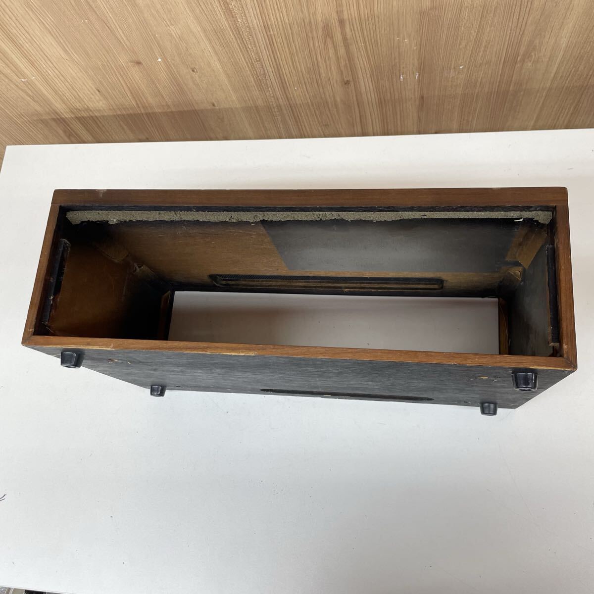 底面木材ケースを固定することができない状態です。底面に4箇所ネジ穴があるものの、ネジがなくなっております。ただ被さっているなので、傾けると滑り落ちてきてしまいます。