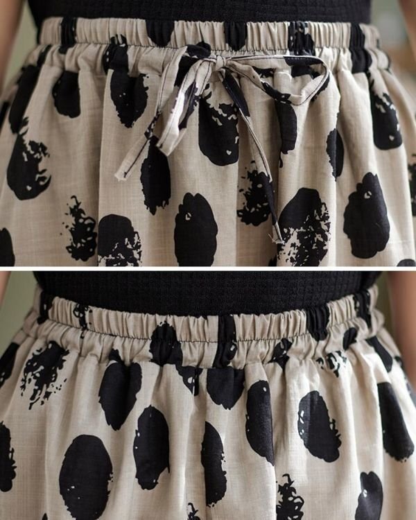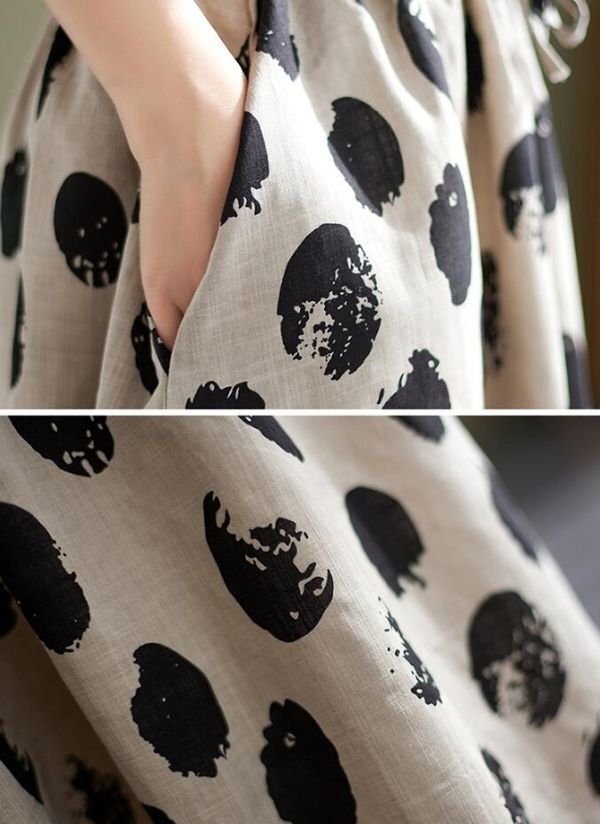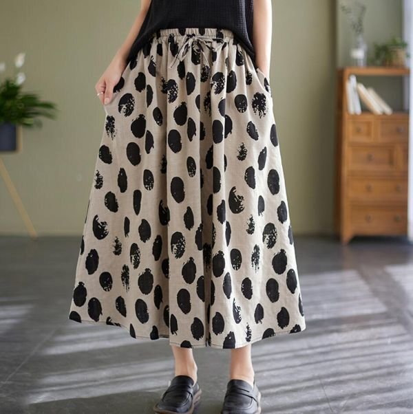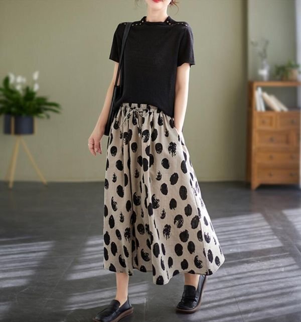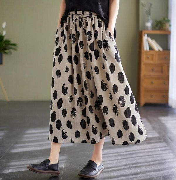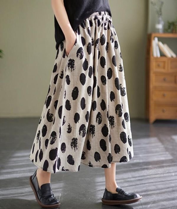 春新品 ワイドパンツ ガチョウパンツ レディースボトムス 着やすい ゆったりプリント柄 綿麻混パンツ★黒 /Mサイズ
