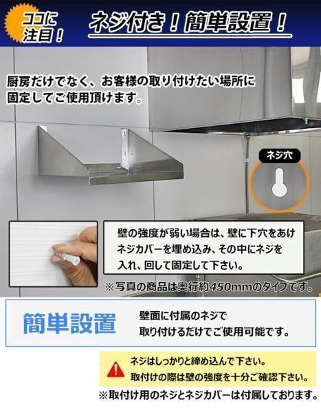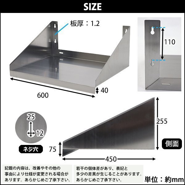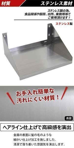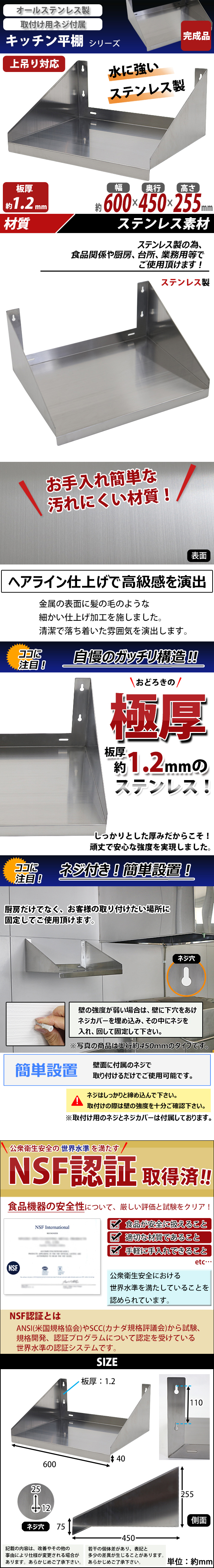 | 商品名 | 送料無料 ステンレス製 棚 完成品 シェルフ キッチン平棚 幅約600mmx奥行約450mmx高さ約255mm 吊り平棚 オールステンレス製 ネジ止めタイプ 吊り棚 つり棚 吊棚 ステンレス平棚 キッチン吊り棚 壁棚 ラック ウォールラック SUS 壁面収納 収納棚 業務用 厨房 wmks450600 |