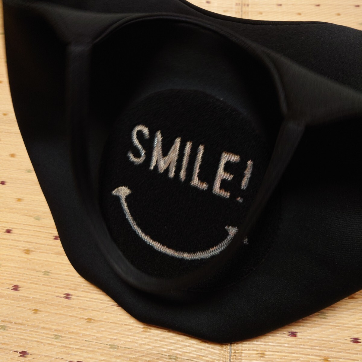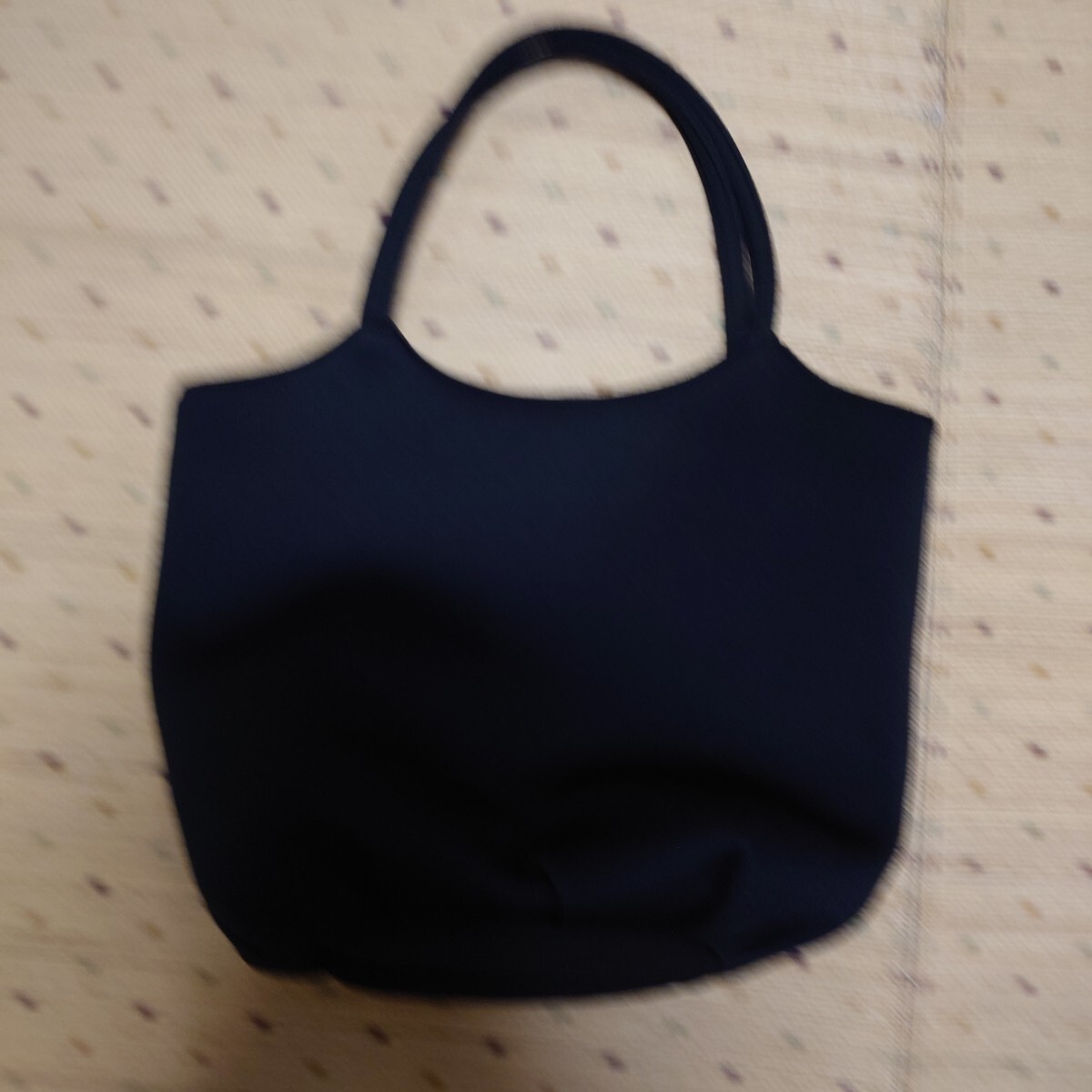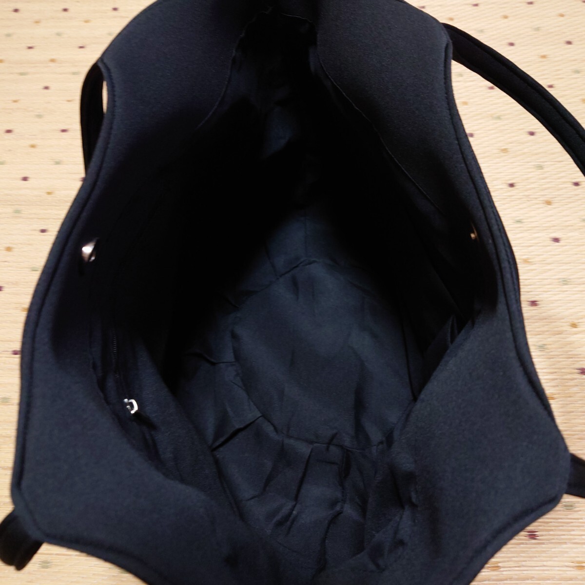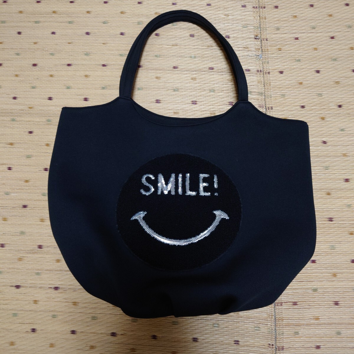 キラキラスマイルロゴが特徴的な軽くて大容量な黒のトートバッグです。