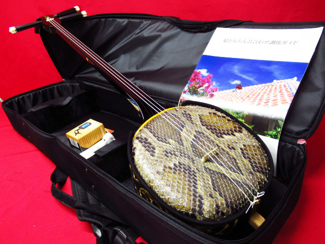 美品 沖縄三線 サンシン 本革 蛇皮 全長約79cm 付属品 ハードケース 付き 和楽器 弦楽器 管理7k0906G-G03