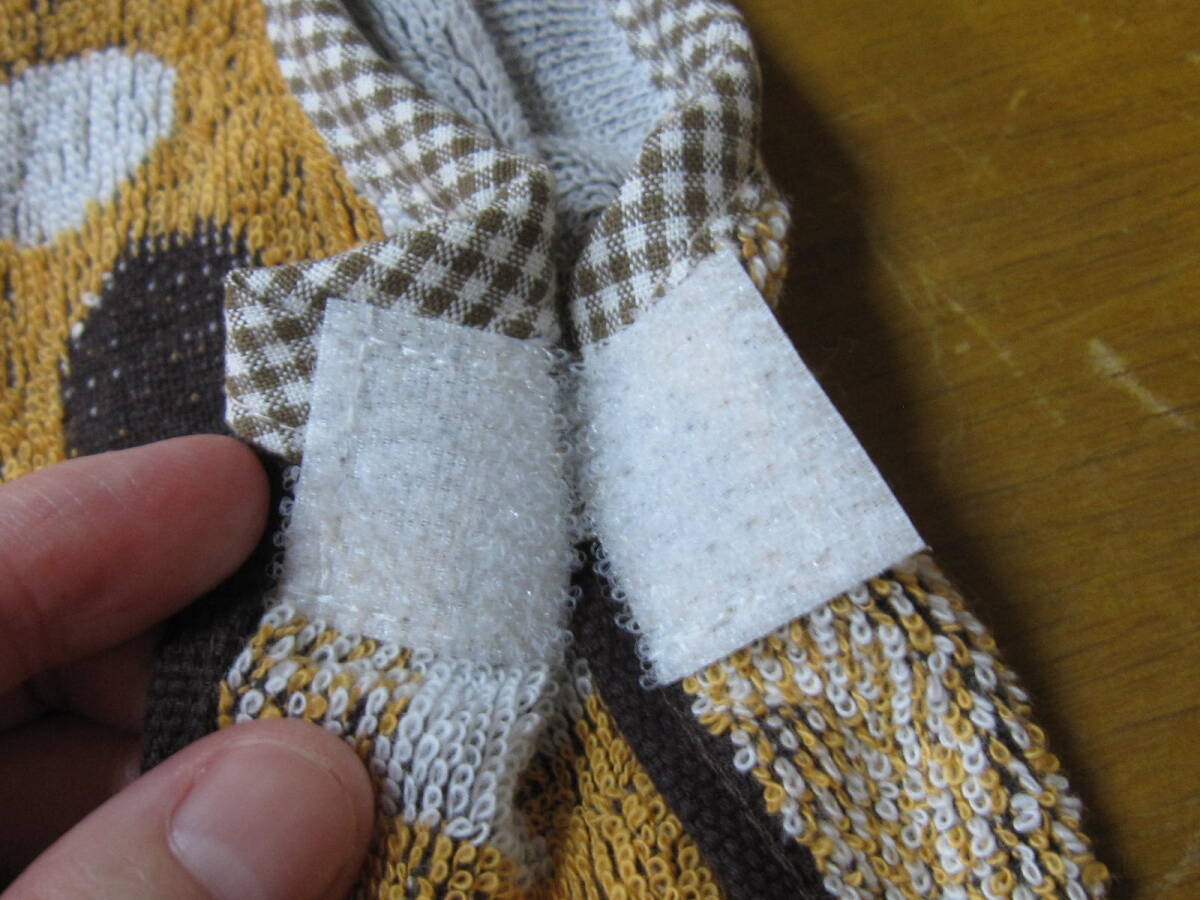 素材は、タオル地・マジックテープ (白) ・綿100% です。