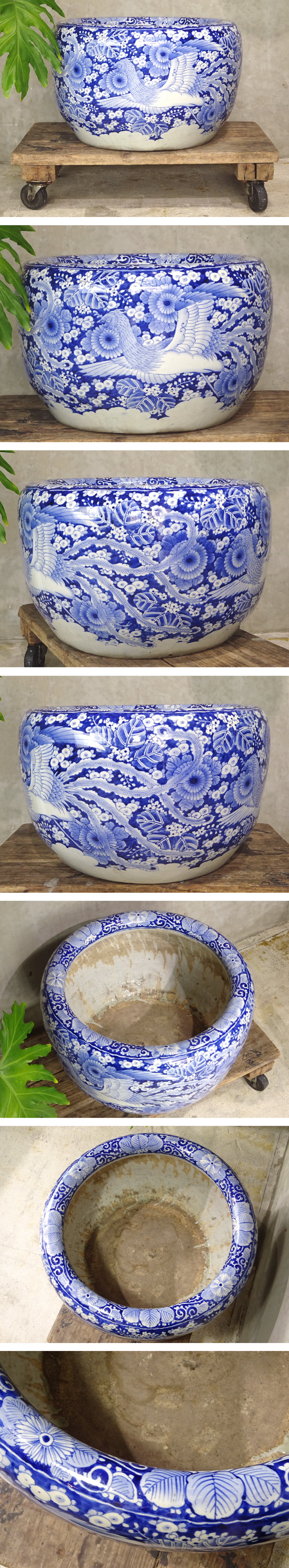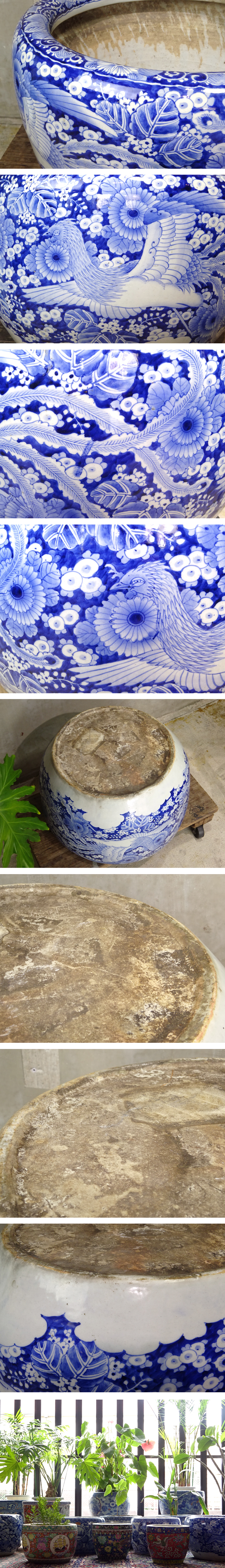 明治時代 古伊万里 染付 鳳凰花文 火鉢 観葉植物 鉢カバー 植木鉢 メダカ鉢 金魚鉢 睡蓮鉢にも 瀬戸火鉢 手焙S31