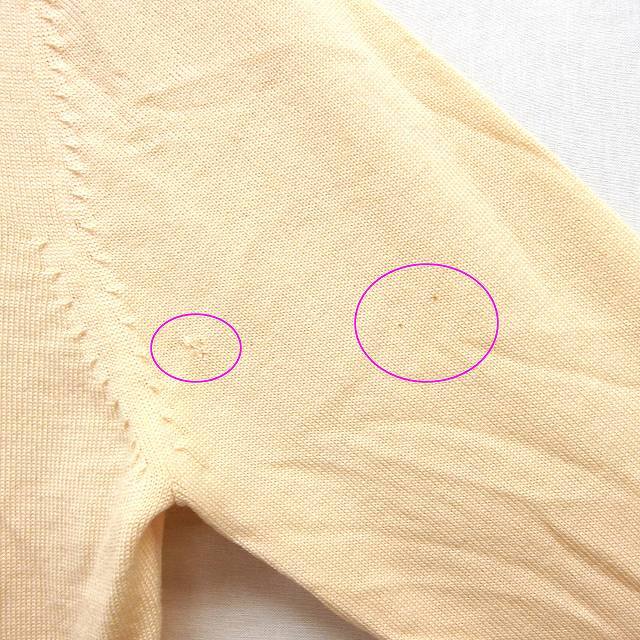 【状態】この商品には下記のようなダメージがあります。 ・ブランドタグ部に茶色い薄汚れ ・前身頃の中央部、左脇付近に小さな穴 ・左袖部に細かな茶色い汚れ ・少々の毛羽立ち ※全体的に中古品としての使用感と上記のようなダメージがありますが、通常使用には支障のない商品です。掲載写真や記載内容をご確認いただき、ご理解の上ご購入ください。