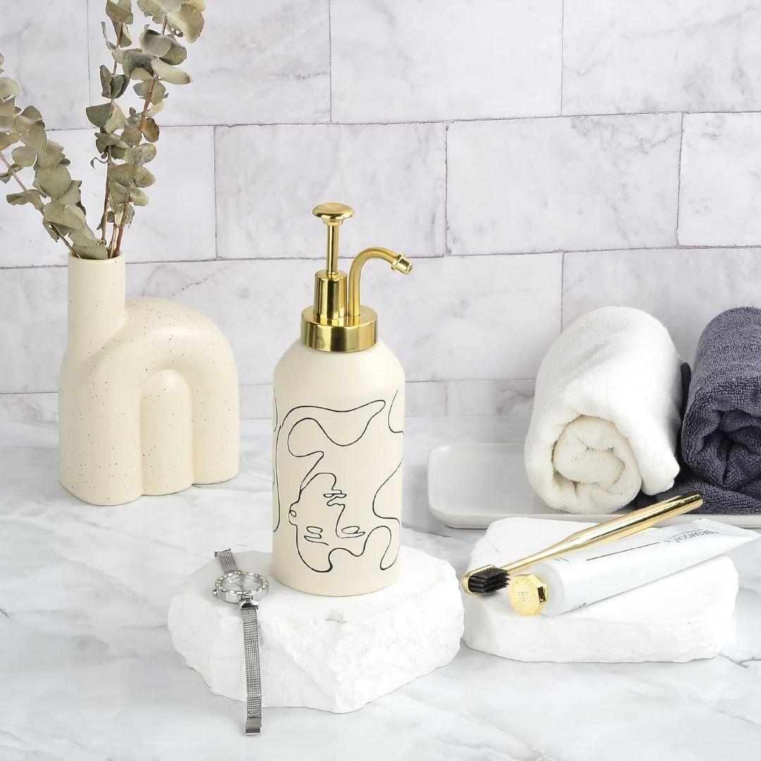 このベージュのソープディスペンサーはセラミック製です。強くて耐久性があり、錆びる心配がない