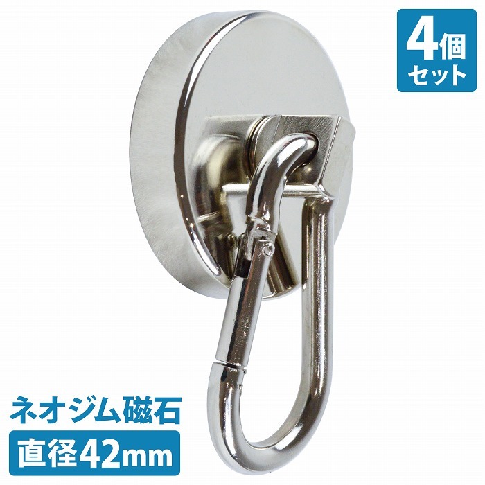 【送料無料】『4個set 直径42mm』カラビナ マグネットフック 超強力 マグネット ネオジム 磁石 フック 防錆 ステンレス製 耐荷重68KG