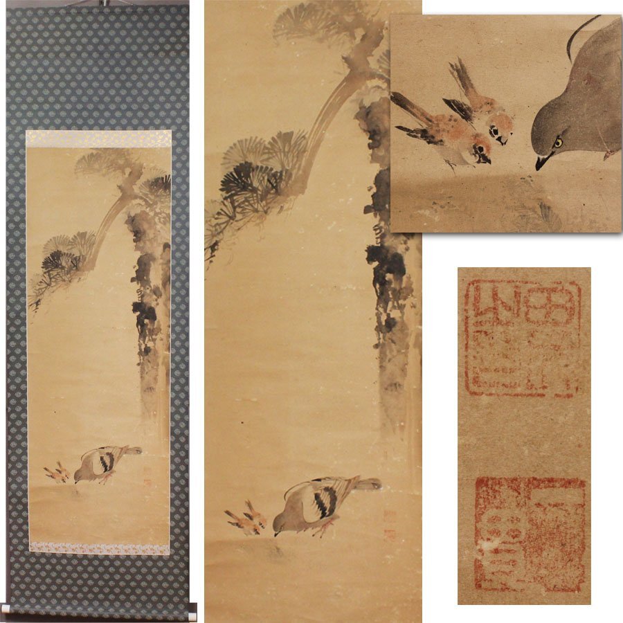 ■商品説明 下記、田能村直入の手により、 丁寧な筆使いにて老松の下で、 一生懸命、餌を啄んでいる、鳩と雀の姿が描かれたと言う作品です。 (落款のみでしたので「伝・」との表記とさせて頂きました。) 《 田能村直入 》 竹 本名:三宮伝太。 別号:小虎・山樵・笠翁・画仙堂。 田能村竹田の養子となり、京都府立画学校長などをつとめた 明治時代の南画の大家。 直入という号は自分の直入郡の地名からとったもの。 明治40年(1907年)没。行年94歳。 ■紙本・肉筆 ■状 態 時代なりのヤケ・オレ・表装以前の虫食い跡等あり。 ■寸 法 軸寸法/約204.0cm×約61.5cm。 本紙寸法/約133.0cm×約48.0cm。 ■落 款 御覧の様な落款等あり。 ■箱 用心箱。 【即決・送料無料】の表示商品に限り、 一部地域(北海道・沖縄)を除き、送料無料キャンペーンを実施しております。 ご希望の方は、お早めに入札して頂けます様、宜しくお願い致します。 【※※なお、作品に対して疑問や質問がある場合には、※※】 質問欄もしくは、ストア情報に当方の情報が記載されておりますので、こちらをクリックしてお問い合わせ下さい。 宜しくお願い致します。 |