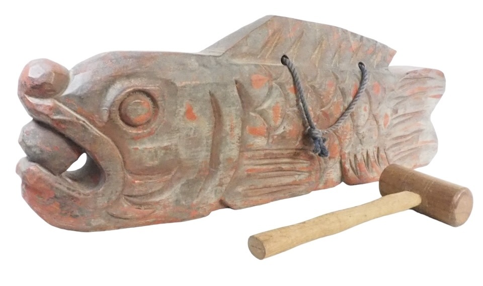 使い込まれた味わいが素敵な魚鼓! 大正期〜昭和初期ビンテージ 魚鼓 木魚 魚板 呼び子 木槌 茶道具 仏具 古民具 NKY609