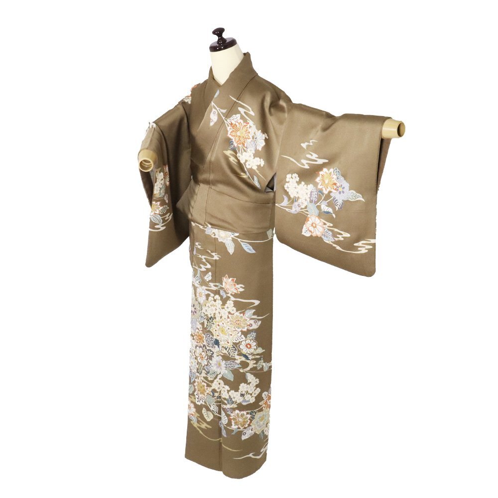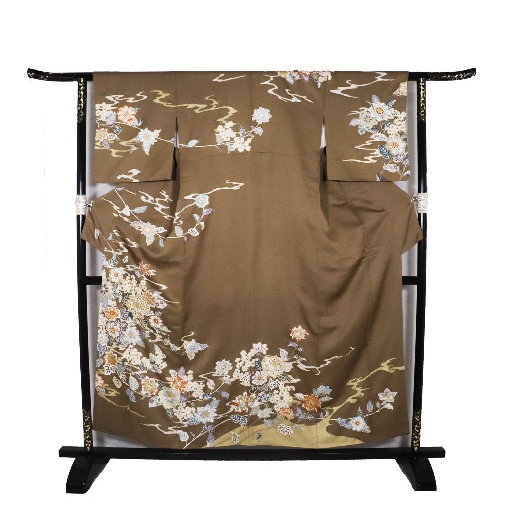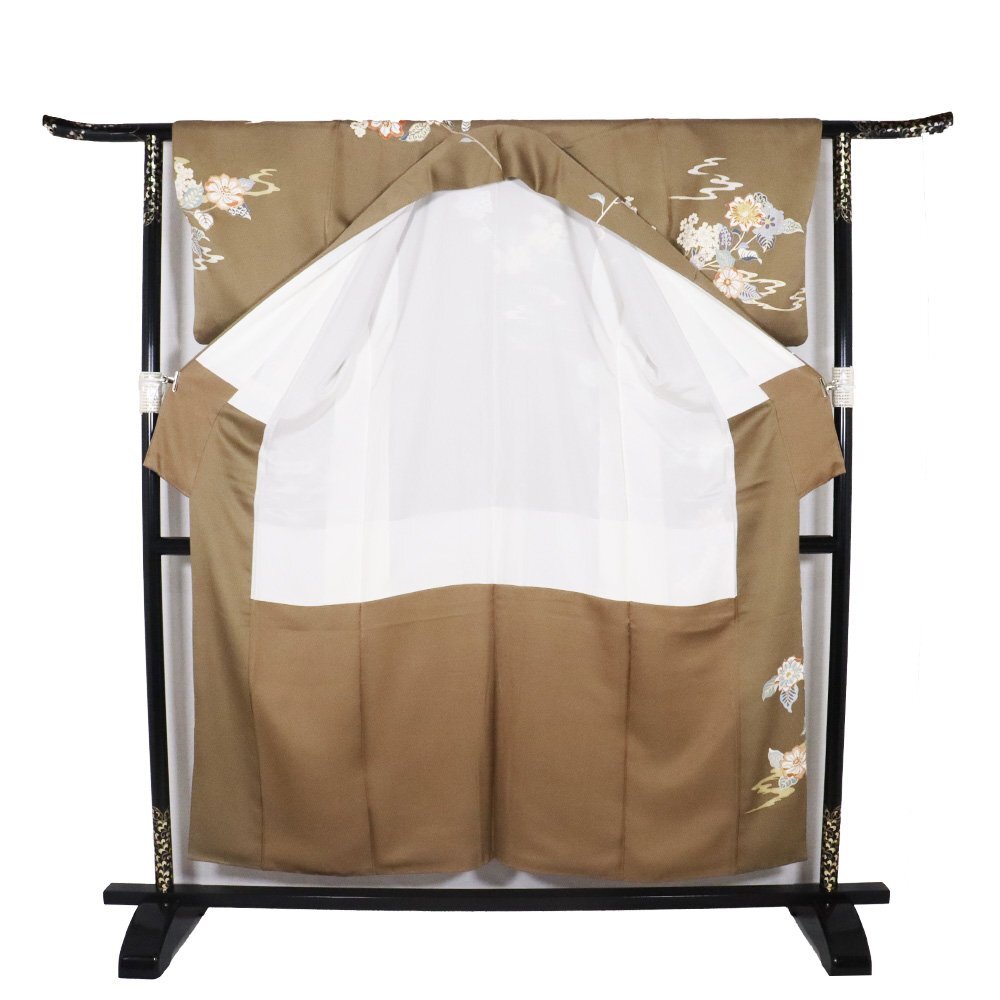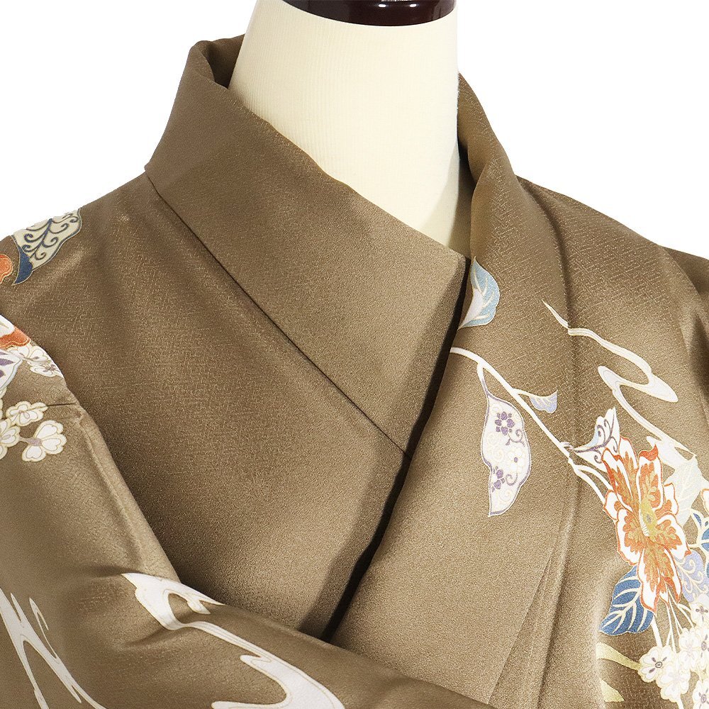 | 訪問着 袷 丹後縮緬地 茶色(薄い枯茶色)・本紋地模様地 唐花 紺駒刺繍入り 160 広襟 | |