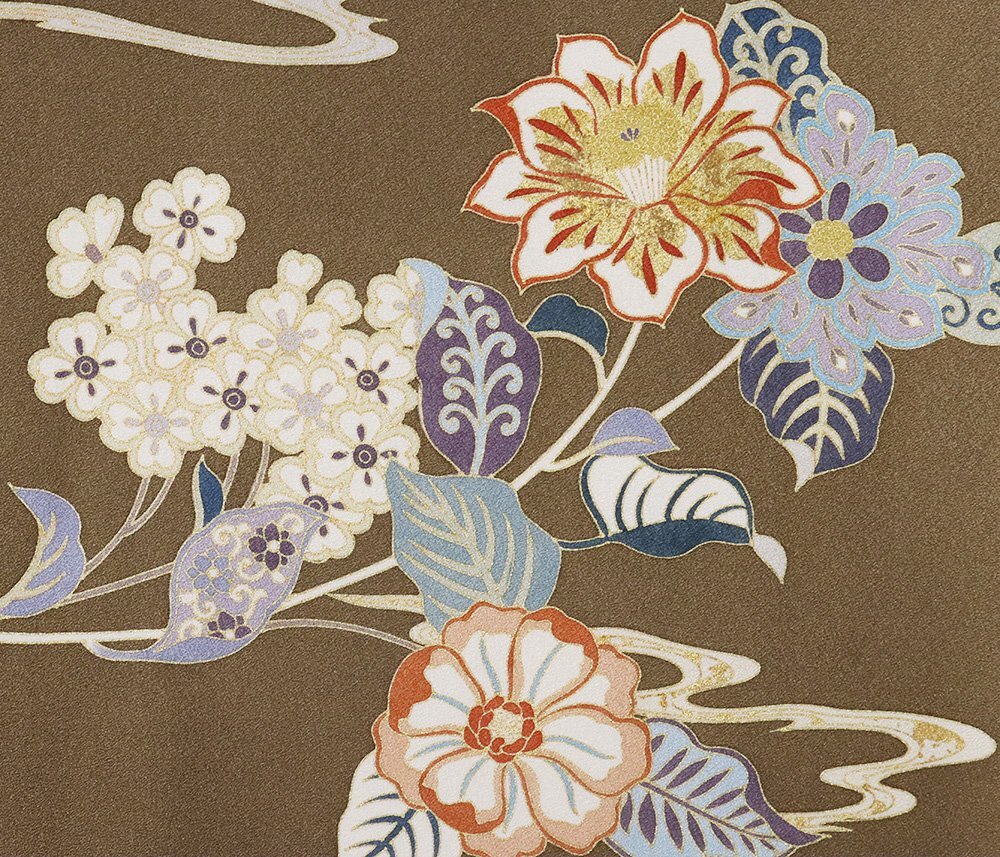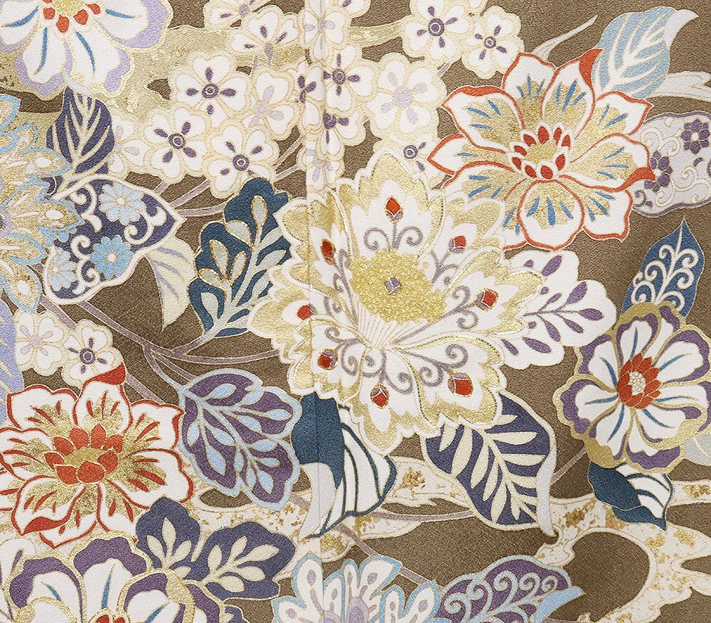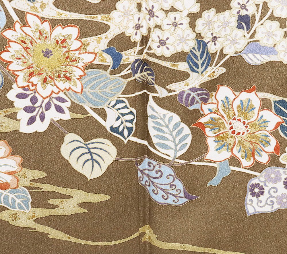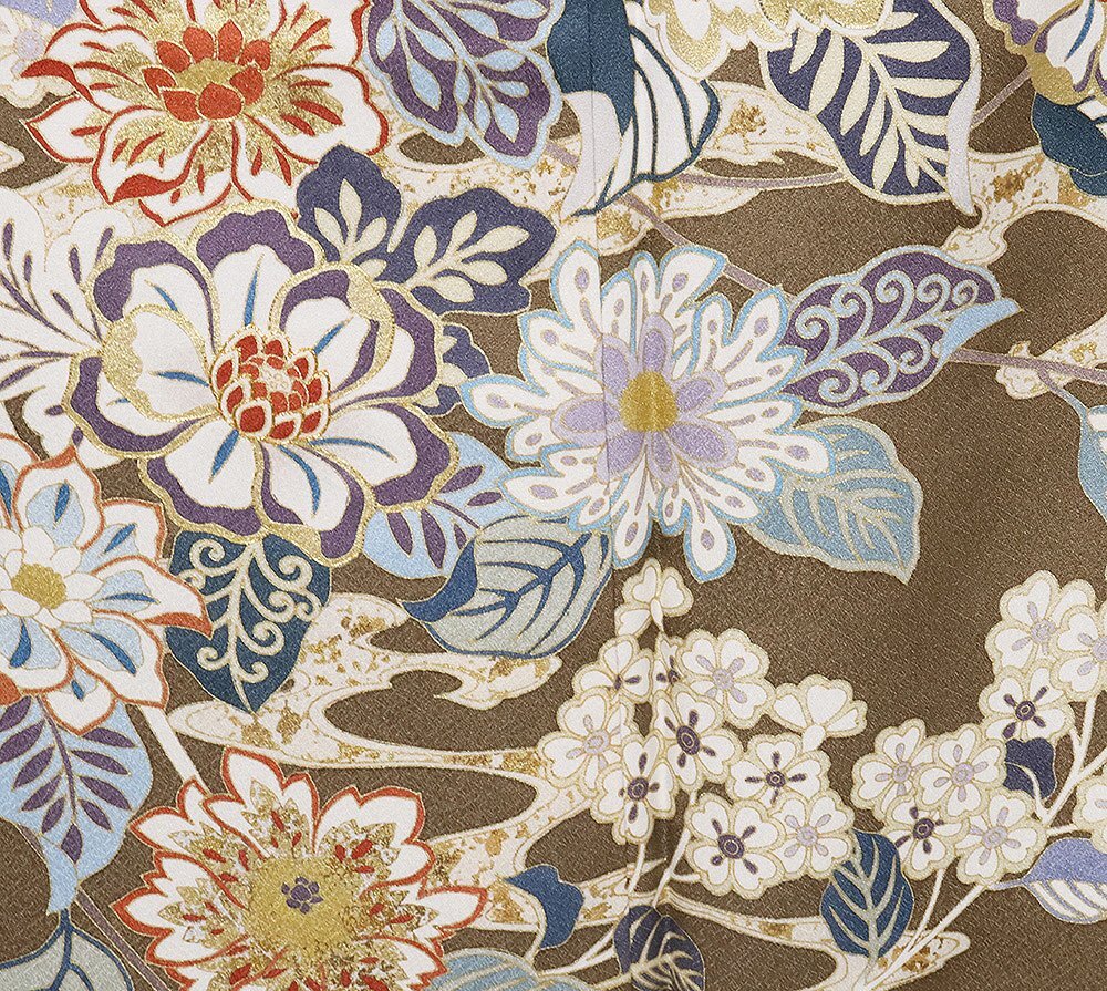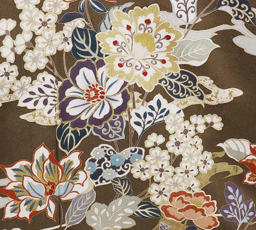 | 色・柄 | 訪問着 袷 丹後縮緬地 茶色(薄い枯茶色)・本紋地模様地 唐花 紺駒刺繍入り (写真では上手く色が出ない場合があります。ご了承下さい) |