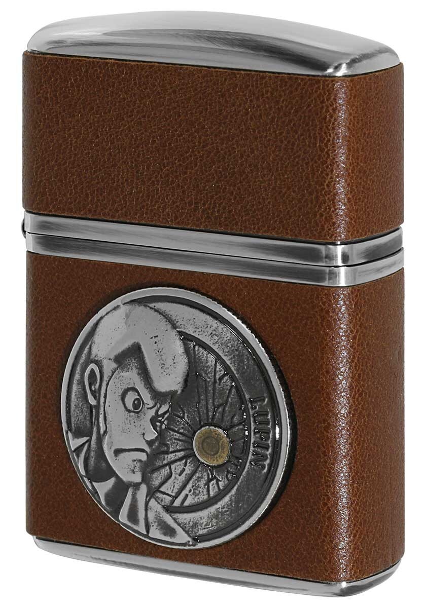 アーマーケースの重厚な質感と、牛ヌメ革巻きの光沢が織りなす、ハードボイルドなテイスト溢れるZIPPO。ルパンの背景には弾痕、次元の背景にはリボルバーをデザインし、また革から浮きすぎないように厚さを考慮して成形。金属と革という異素材の組み合わせながら、一体感溢れる完成度燻されたシルバーのメタルと、落ち着いた光沢の革巻きが、ルパンファンにはたまらない男らしさを演出するアイテム!