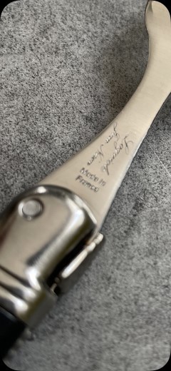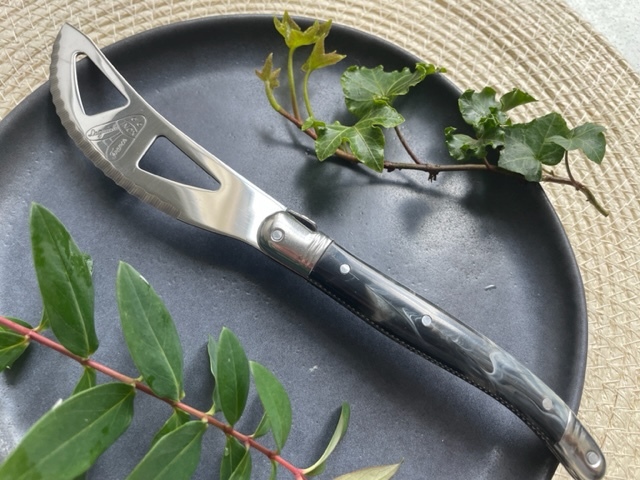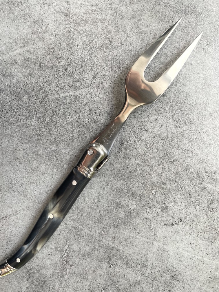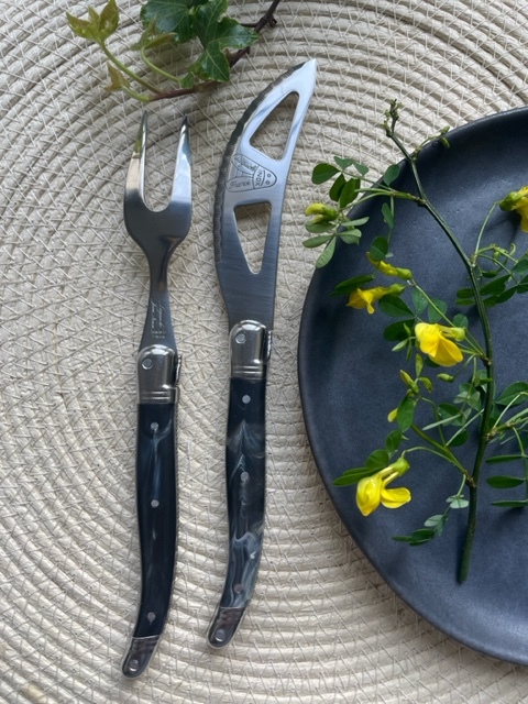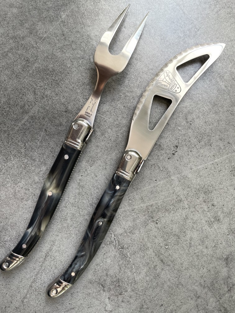 フランス製Laguioleのピザナイフです。1899年創業の伝統アトリエJean Neronの製品です。 ナイフ:長さ22.5cm重量66gステンレス幅1.2mmにPlatine飾りステンレスが挟んであります。 フォーク:21.5cm 66g ステンレス幅1.2mmにPlatine飾りステンレスが挟んであります。 ナイフとフォークのセットです、調理パンやお肉もスッパリ切れるブレードですので多様にお使いいただけます。 柄の部分は食器洗浄機対応可能のABS樹脂。ラギオールのシンボルマーク蜂が溶接してあり伝統的な流線型のフォームです、刃の部分にはLaguioleの刻印マーク入り。正真正銘のフランス製品ラギオール正規品です。 パテの切り分けやチーズナイフとしても用途多様 、固定し押さえるのに適した先が尖った2又のフォークはご要望が多かったのでセットにしました。 黒大理石色は個々に乳白色が違います、写真と同じ柄ではありません | |||