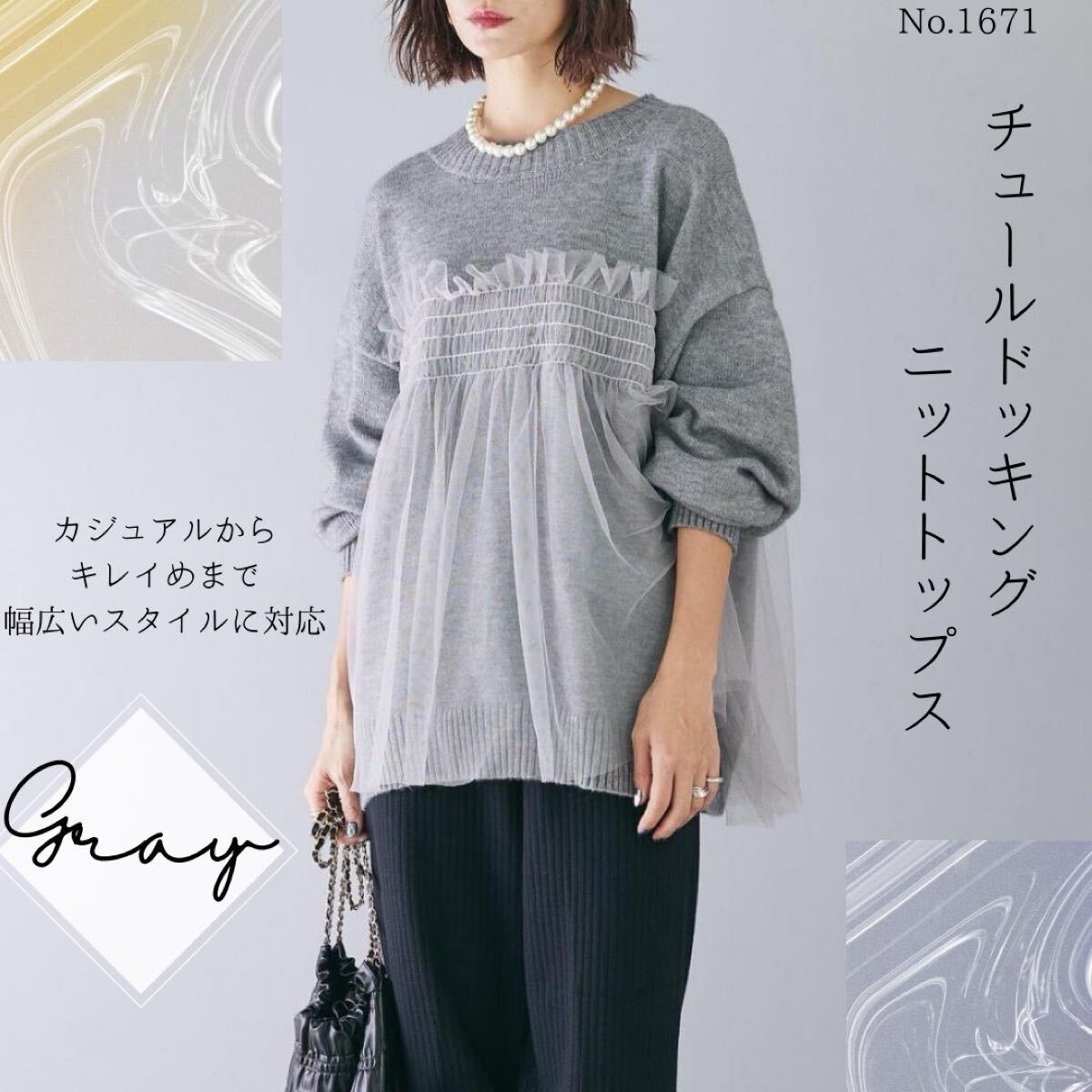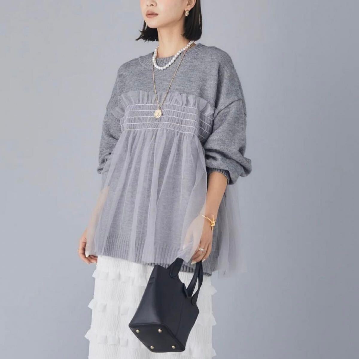柔らかなニット素材と胸元から裾にかけて広がる繊細なチュールが融合したフェミニンなトップスです**