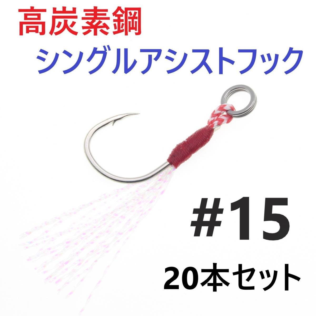 【送料無料】高炭素鋼 シングル アシストフック #15 20本セット ジギング メタルジグ 伊勢尼針 ティンセル スプリットリング付き