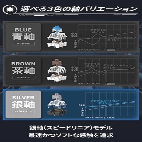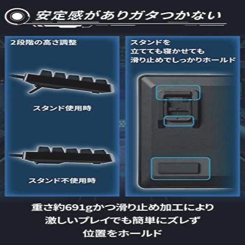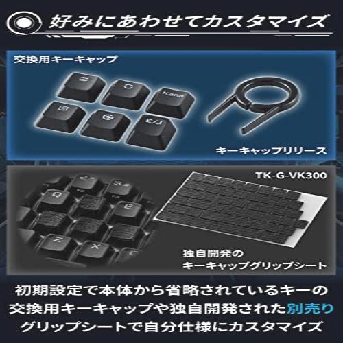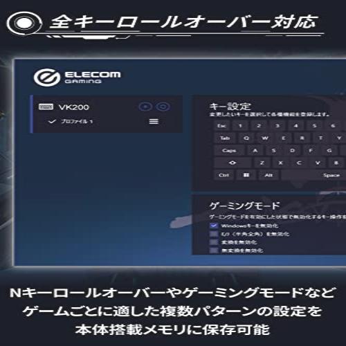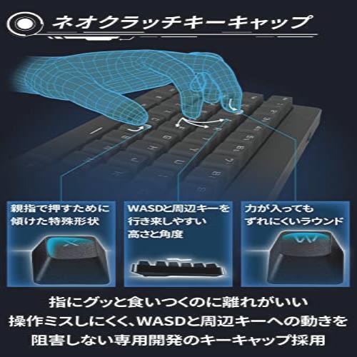 | ブランド:エレコム(ELECOM) カラー:銀軸 スピードリニア サイズ:65%サイズ 【 仕様 】 ■ コネクタ形状:USB-Aオス ■ 接続方式:USB有線 ■ 対応機種:USBポートを装備したWindowsパソコン ■ 対応OS:Windows 11/10/8.1 ■ キー配列:日本語配列 ■ キー数:71キー ■ キーピッチ:19.0mm ■ キータイプ:メカニカル(銀軸/スピードリニア) ■ キーストローク:3.5mm ■ アクチュエーションポイント:1.4mm ■ 動作圧:45g ■ タクタイル圧:無し ■ レポートレート:最大1,000Hz ■ USBポート数:1ポート ■ 電源:USBバスパワー ■ ケーブル長:約1.5m ■ サイズ分類:65%サイズ ■ 外形寸法:約幅322.4mm×奥行124.7mm×高さ36.2mm(スタンド含まず)約幅322.4mm×奥行124.7mm×高さ48.0mm(スタンド時 ) ■ 重量:約691g ※ケーブル含まず ■ 内容物:VK200本体、パラコードケーブル、交換用キーキャップ×6個、キーキャップリリース、V customロゴステッカー ■ VCCI:ClassB対応 ■ カラー:ブラック ■ 保証期間:2年 【 説明 】 ■ “ELECOM GAMING V custom"は、プロからエントリーまで、勝ちにこだわるすべてのプレイヤーの皆様と向き合い、数値性能だけでなく、感覚的な使い心地を大切に作り込んだ、一人ひとりにぴったりハマる“勝てるデバイス"をお届けする、エレコムの新しいハイクラス・ゲーミングデバイスシリーズです。 ■ ガンシューティング系ゲーム(FPS)の高速な指の動きにもぴったりハマるサイズ感、キー配列、キー形状を精緻に作り上げた、銀軸搭載の65%サイズゲーミングキーボードです。 ■ キー入力における応答速度(Speed)、精度(Precision)、安定性(Stability)を高めた新開発のゲーミングキーボード用エンジン“ELECOM Wireless S.P.S Engine for Keyboard"を搭載しています。 ■ “ELECOM Wireless S.P.S Engine for Keyboard"は、独自の測定方法による正確な応答速度の計測と、プロゲーマーによる感性評価により、応答速度を当社比で約55%高速化し、さらに、緻密な精度と安定性の向上を行うことで、業界最速クラスの実効応答速度を実現しています。 ■ プロゲーマーを含むプロジェクトチームにて、幾多の試作の末に生み出された“ネオクラッチキーキャップ"は、キーが指にグッと食いつきつつも離れやすいといった、ゲームプレイに適しており操作ミスをしにくいキー形状を実現しています。 ■ WASDをホームポジションとして、その周辺キーを縦横高速に往復するゲーム特有の指の動きを邪魔しないよう、1つひとつのキーの相対高さや角度を調整しています。 ■ ゲームプレイ中の各指のキーストローク角度を研究し尽くし、高速で打ち込んでも指がずれないようキートップをラウンドさせ、Z~Mキーは左手親指での操作に適した特殊なアシンメトリー形状を採用しています。 ■ キーの印字は、色の異なるプラスチック材料で文字を成型する“ダブルインジェクションPBTキーキャップ"を採用し、キー印字の塗装が剥がれにくい、圧倒的な耐摩耗性を実現しています。 ■ デスク上でマウスの操作スペースを最大限に確保できる65%サイズの独自日本語配列を採用しています。 ■ コンパクト配列のキーボードでは省略されやすいESCキーなどのゲーム中の操作頻度が高いキーや、スクリーンショット撮影のPrintScreenキー、観戦中に便利なPageUpキー、PageDownキーを搭載しています。 ■ テキスト入力とゲームプレイのしやすさを両立させるため、プレイヤー同士のチャットなど、日本語入力もスムーズに行えるよう、半角全角キーや方向キー、Deleteキーを搭載し、スペースキーを広くとった日本語環境のプレイヤーに適した配列です。 ■ 専用設定ソフトウェア“EG Tool"を使用すると、全キーの機能をカスタマイズできます。 ■ 変換、無変換、かな、メニュー、Gaming、EJキーの6つの純正キーキャップを同梱しているため、キーを取り換えることで各プレイヤーの入力スタイルへ合わせることも可能です。 ■ ※キーへの機能割当を変更する場合は、専用設定ソフトウェアでの設定が必要です。 ■ 本体上面には、ワイヤレスゲーミングマウスと本品をあわせて使用する際に便利な、“追加USBポート"を搭載しています。 ■ "追加USBポート"によって、ワイヤレスマウスの近くにマウス用レシーバーを配置できるため、PC本体に配置するよりも電波が届きやすく、快適なゲーミング環境を実現します。 ■ "追加USBポート"は、1000Hzの1ポーリング(1ミリ秒)にも満たない、わずか約200マイクロ秒という極限の遅延軽減を施したUSBハブ方式を採用しています。 ■ また、ワイヤレス接続の際に電波障害の原因となる、パソコンなどからのノイズをブロックするEMI対策を行っています。 ■ ケーブルは、取り回しがしやすい驚きの柔軟性を持った“着脱式Type-Cパラコードケーブル"を採用しています。 ■ ケーブルのコネクターは、ゲームを行う場所の移動時やデスク周りの掃除に便利で、万が一の断線時にも簡単に交換できるType-C着脱式を採用しています。 ■ スピーディーな押下とソフトな感触を追求した銀軸(スピードリニア)を搭載しています。 ■ 技術者