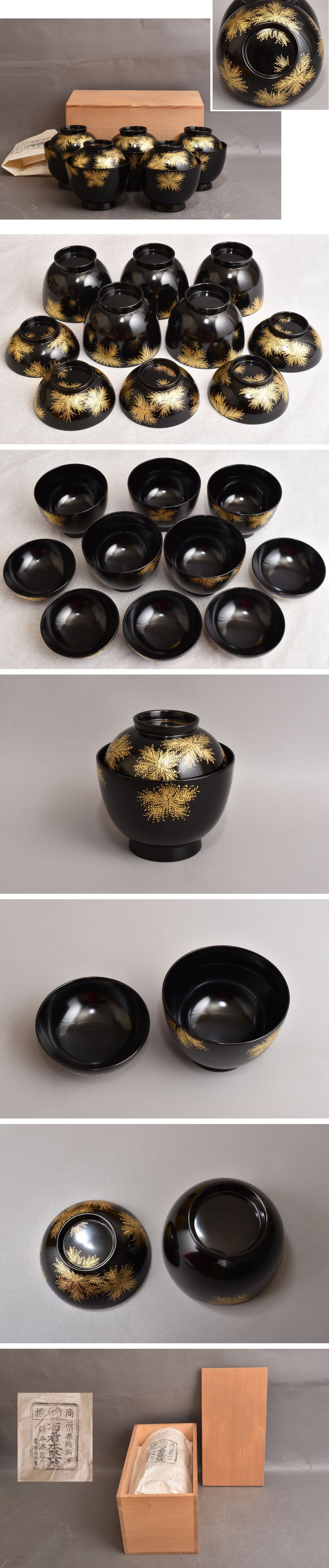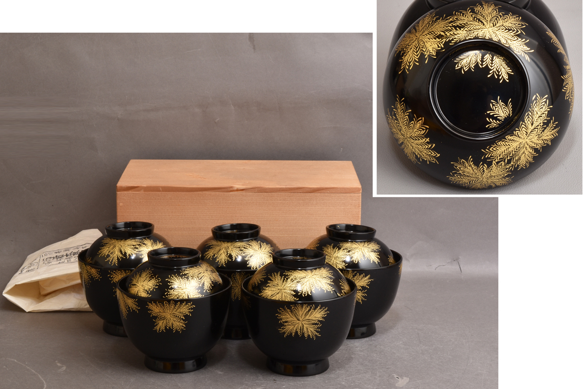 5332 輪島塗 吸物椀 しのぶ草沈金 布着本堅地 新本漆器店 5客 天然木 共箱
