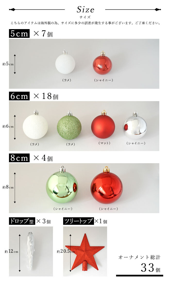 大きさとニュアンスの異なるボールオーナメント、海外では定番のしずく型オーナメント、トップツリーがセットになった合計33個のオーナメントアソートです。
