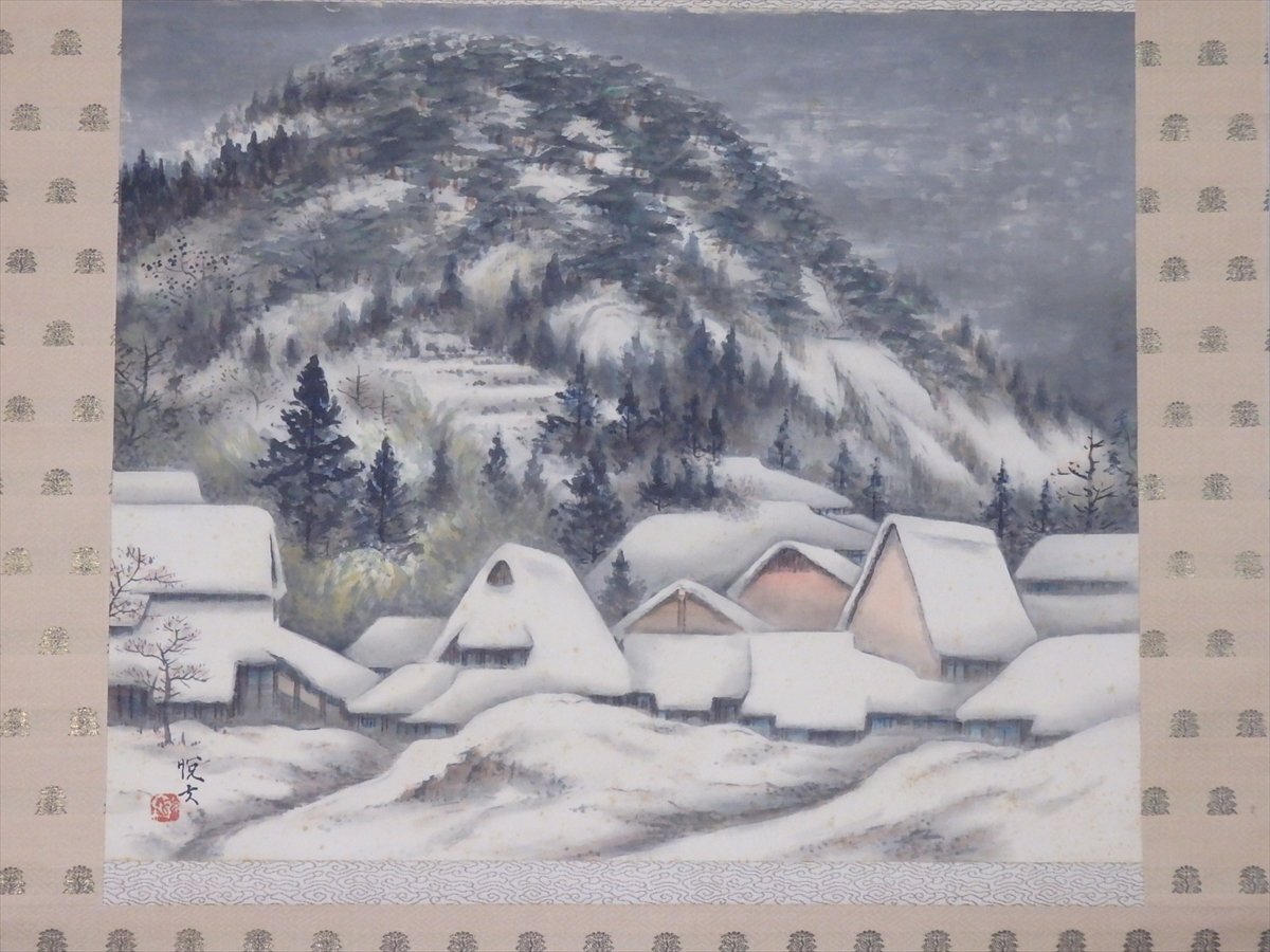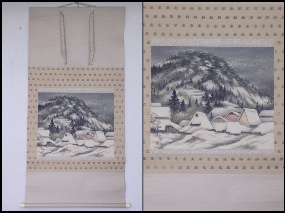 ★肉筆 冬 日本画【掛軸『山村瑞雪』共箱】絹本 幅65.5×全長134.2cm 茶道具 風景 セール!