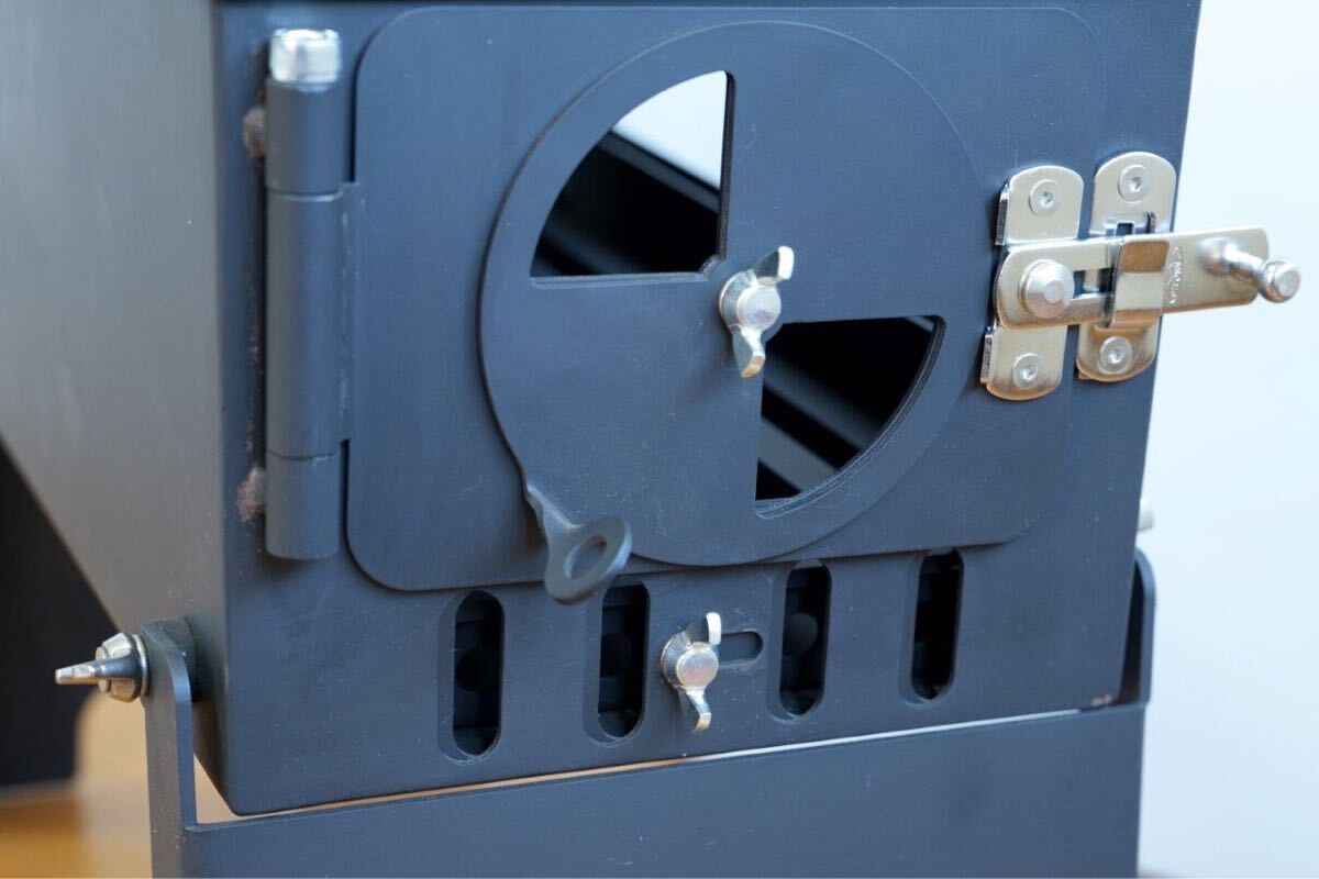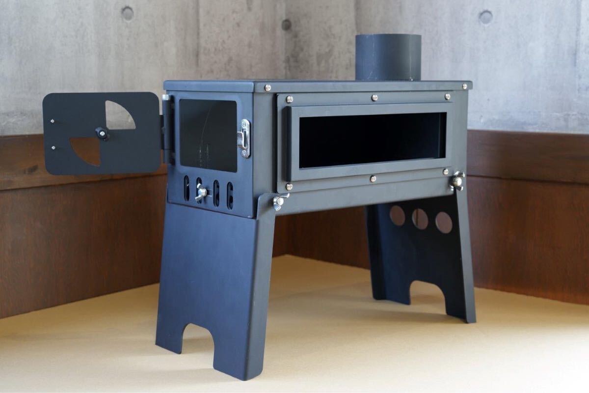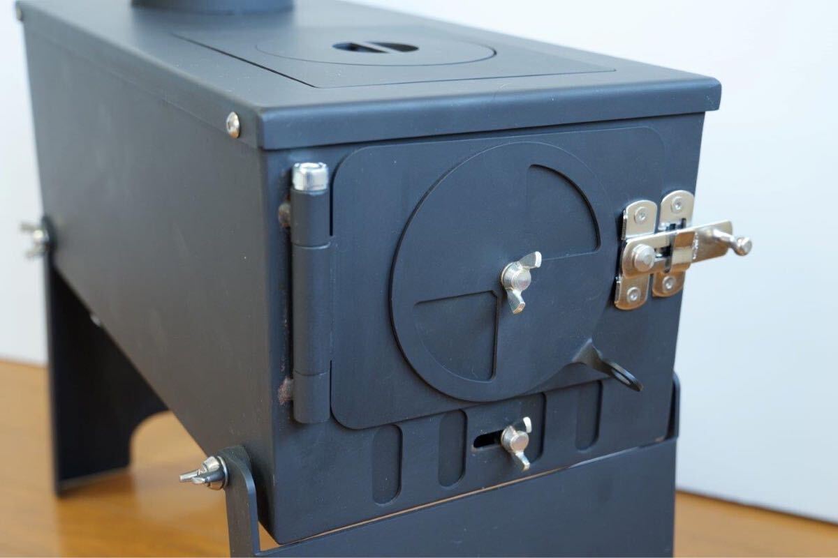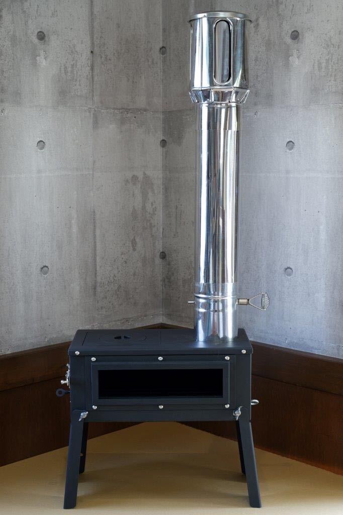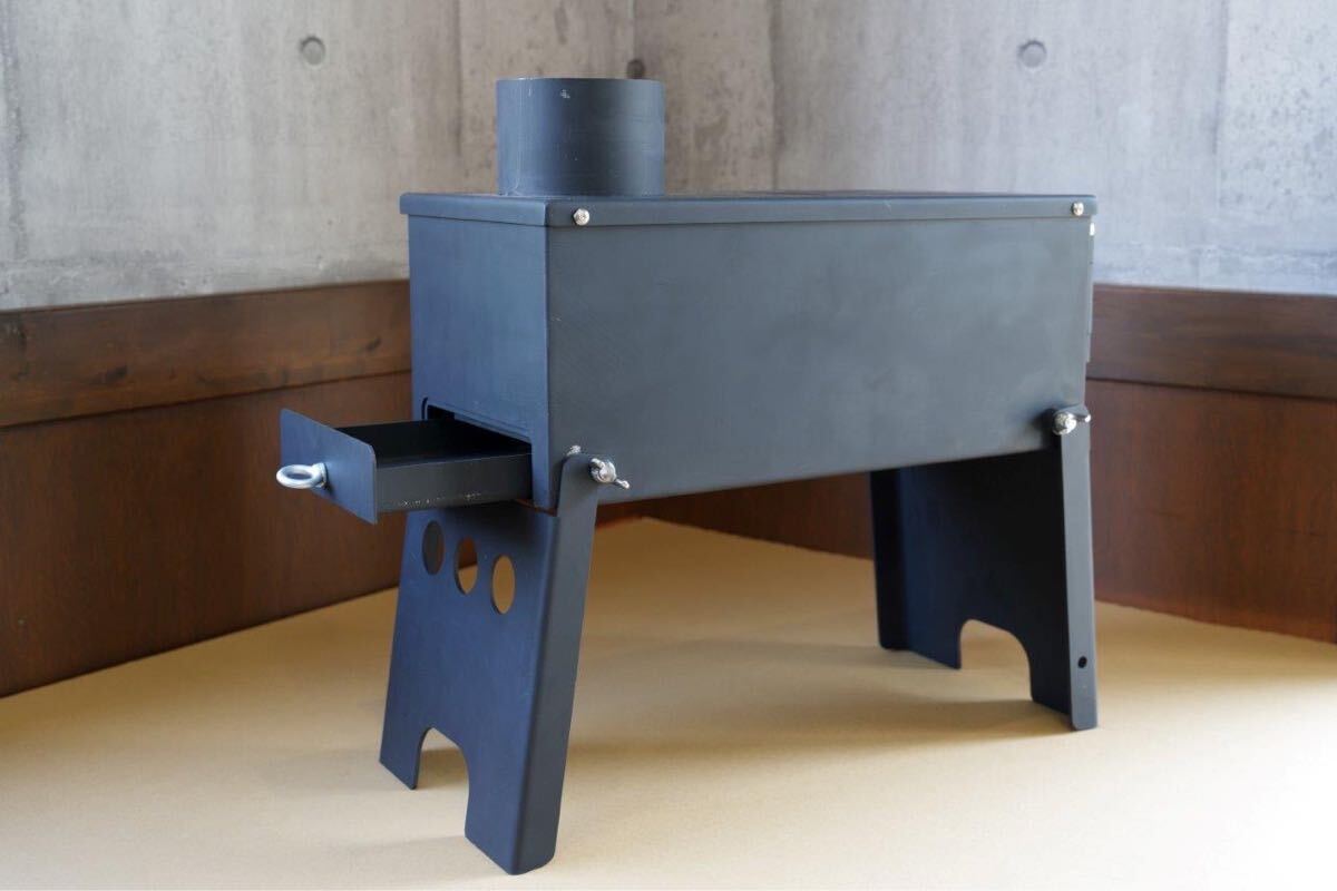 当方金属加工会社につきアウトドア向け製品を製作する過程で、軽バンなどに積んでも転がりにくく場所を取らないコンパクトな薪ストーブが欲しいとのスタッフ意見から製作したものです。