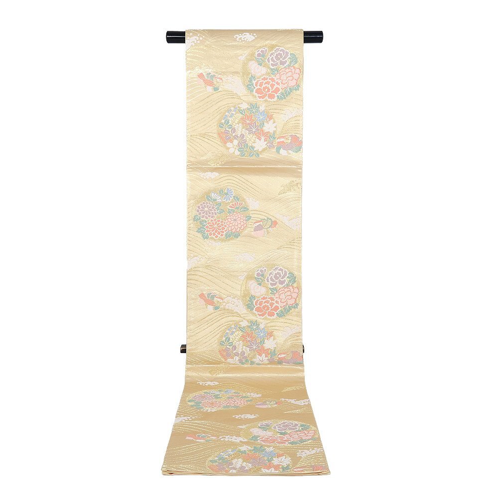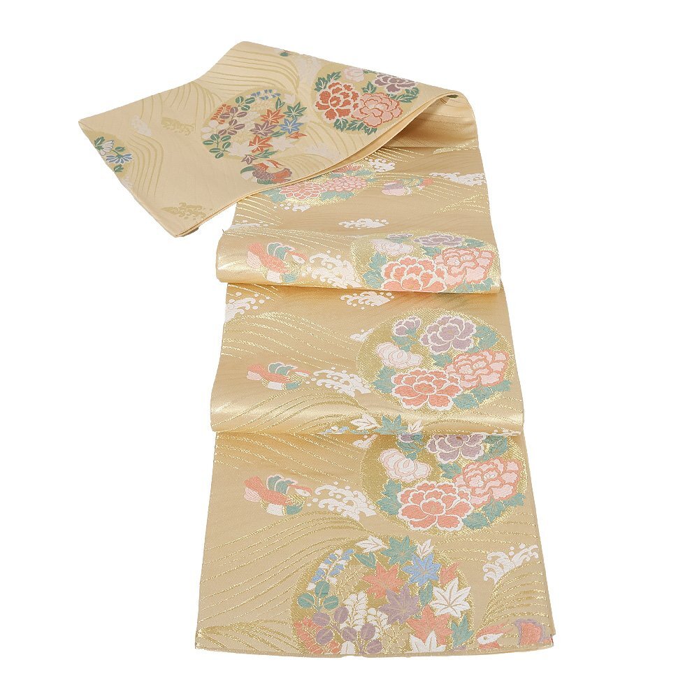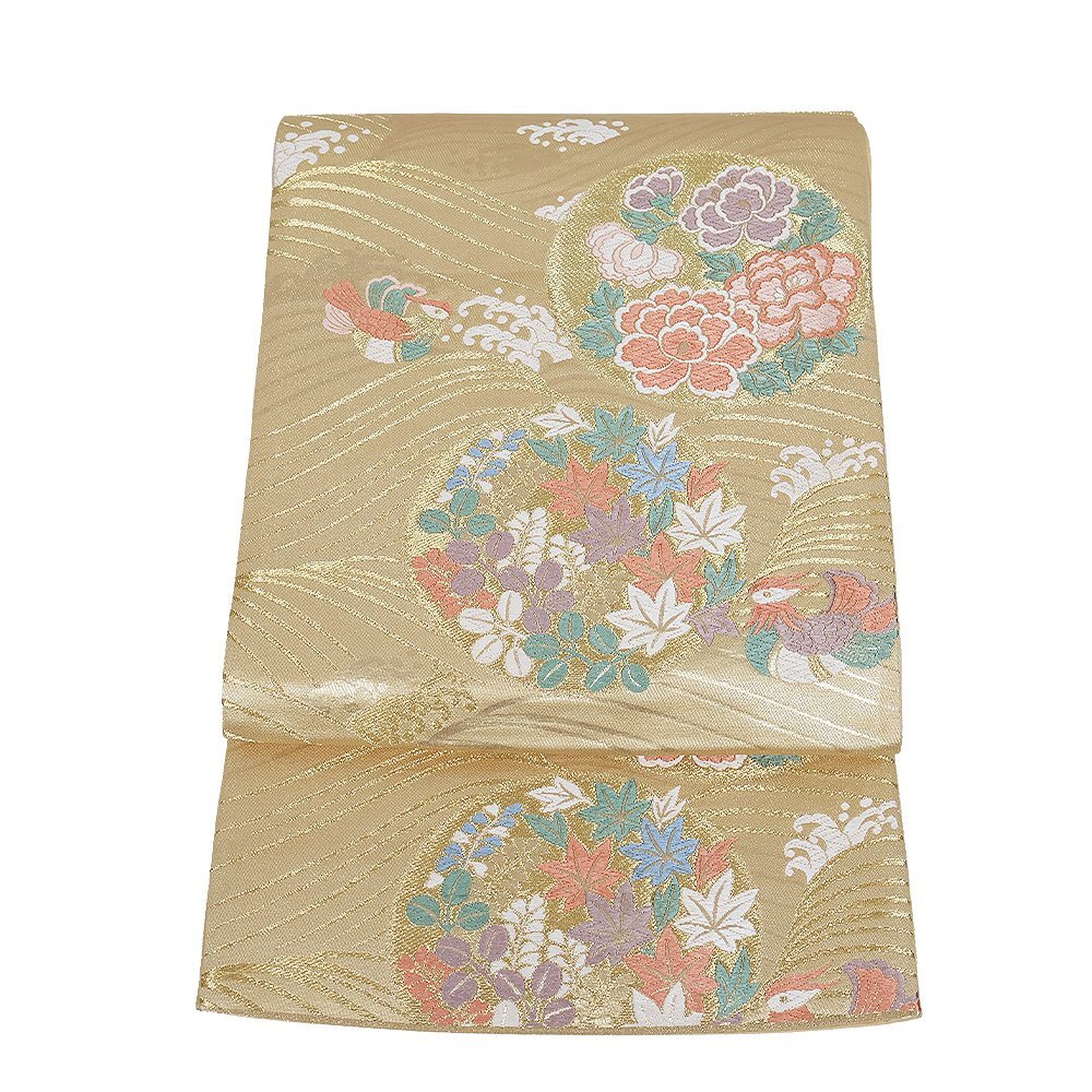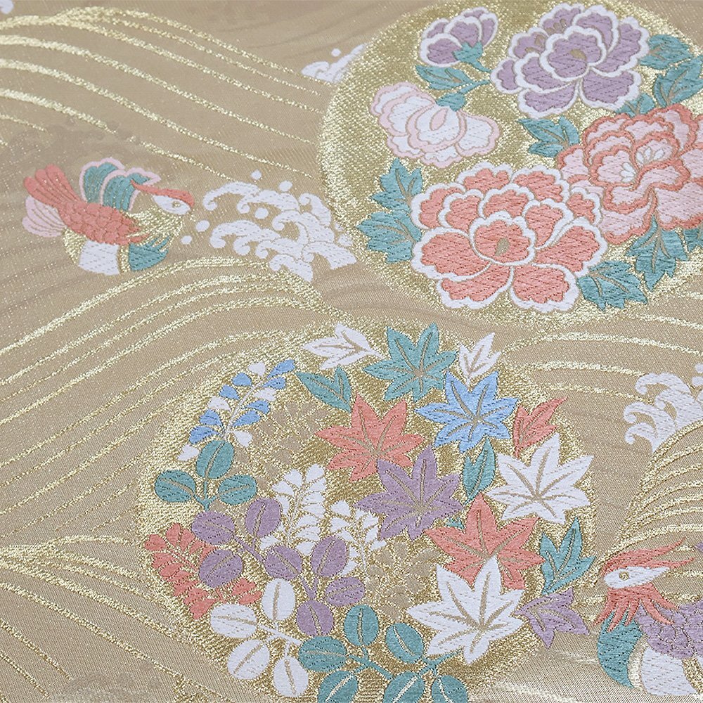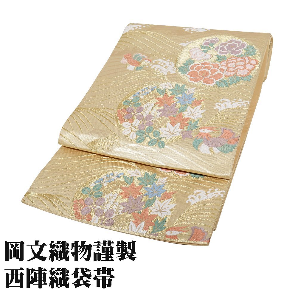 | 岡文織物謹製 西陣織袋帯 唐織割付文 金箔地 唐織・花丸文 牡丹・紅葉・菊・南天・オシドリ・荒波 未使用品 仕立て上がり | |