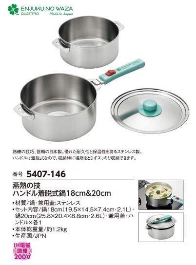| 【商品番号】 5407-146 【商 品 名】 燕熟の技 ハンドル着脱式鍋18cm&20cm |