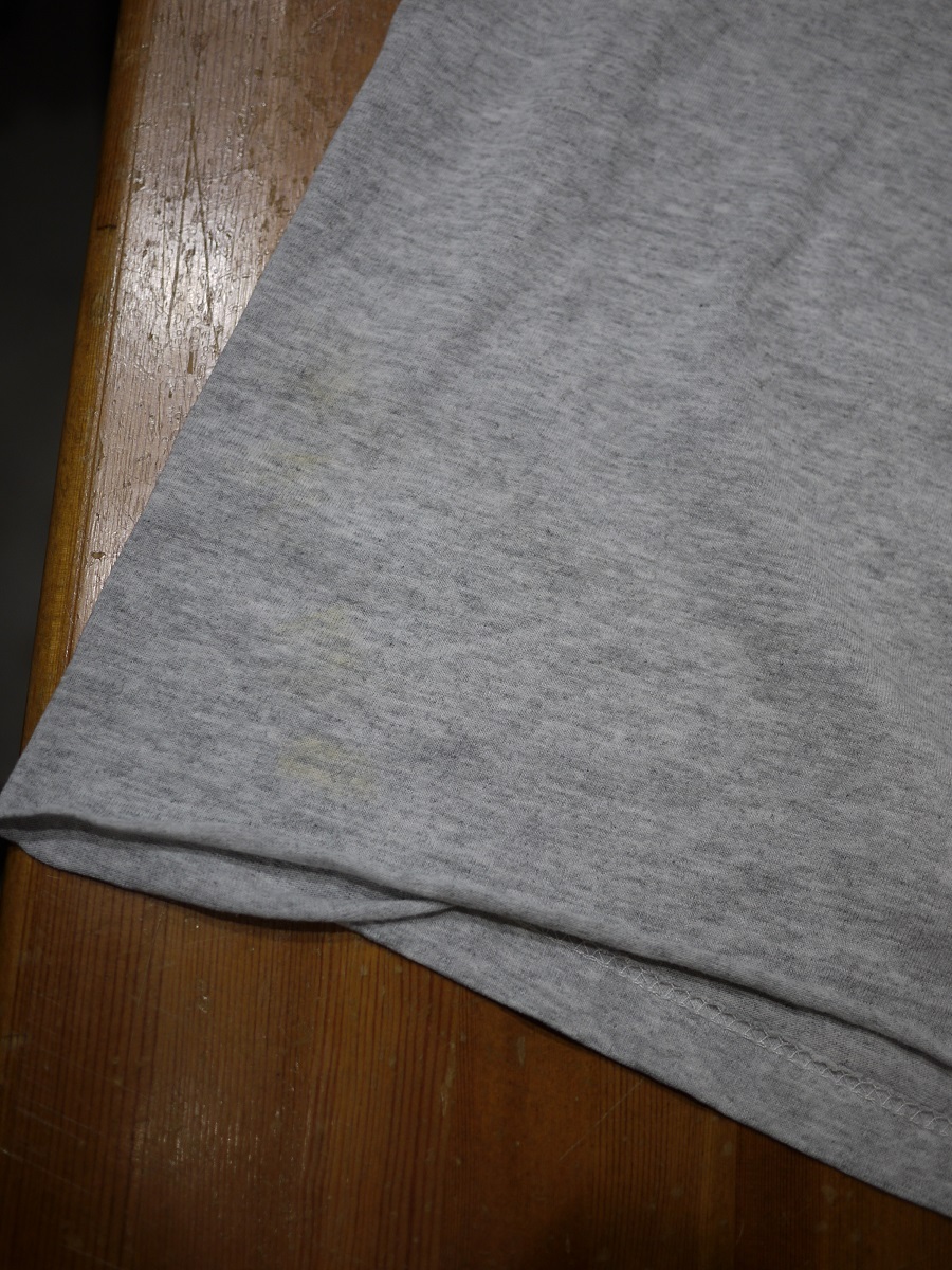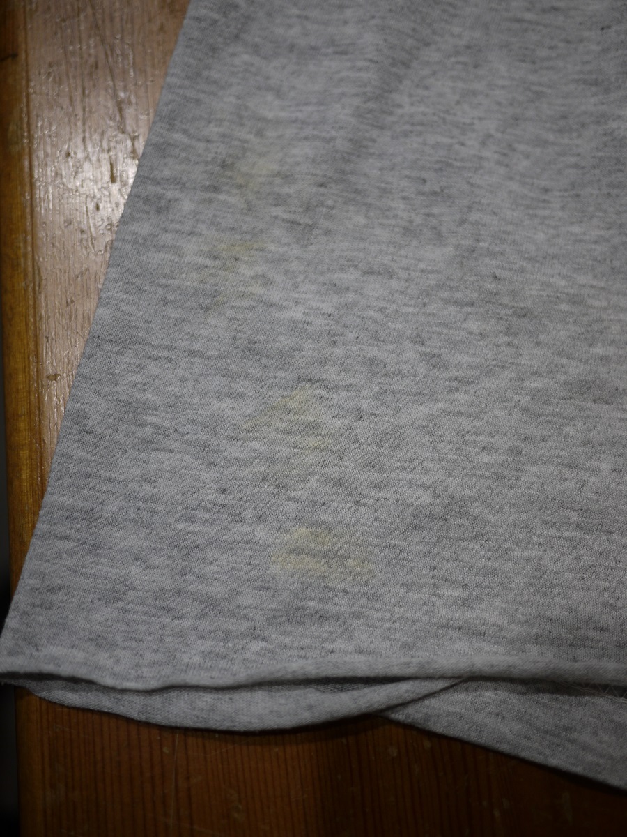 着用感はあり、前身頃にシミ、裾にほつれはあります。