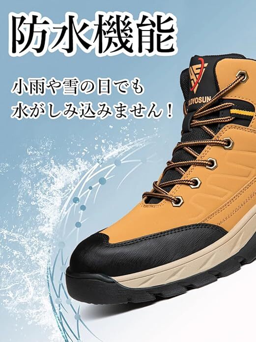 【防水機能】当社の安全靴は防水性に優れた合皮素材を採用し、小雨や雪の日でも水がしみ込みません。突然の雨でも安心!ハイカットのデザインで、足首まで保護してくれます。