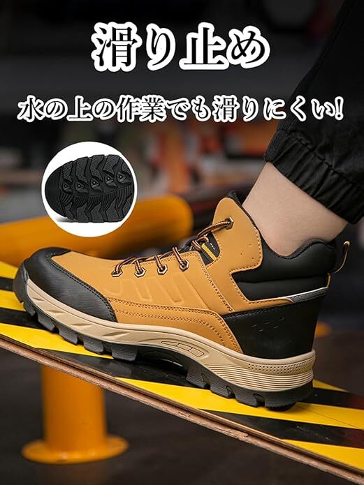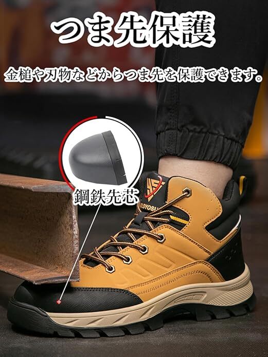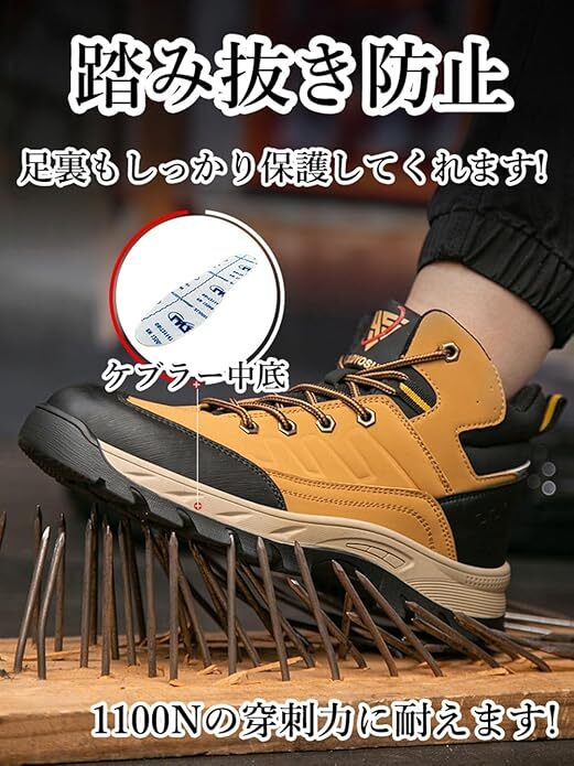 【つま先保護 踏み抜き防止】安全靴のつま先部分に高品質な鋼先芯を入れた、落下物などからつま先を保護できます。また、1100Nの穿刺力に耐えるケブラー中底を搭載し、足裏もしっかり保護してくれます。