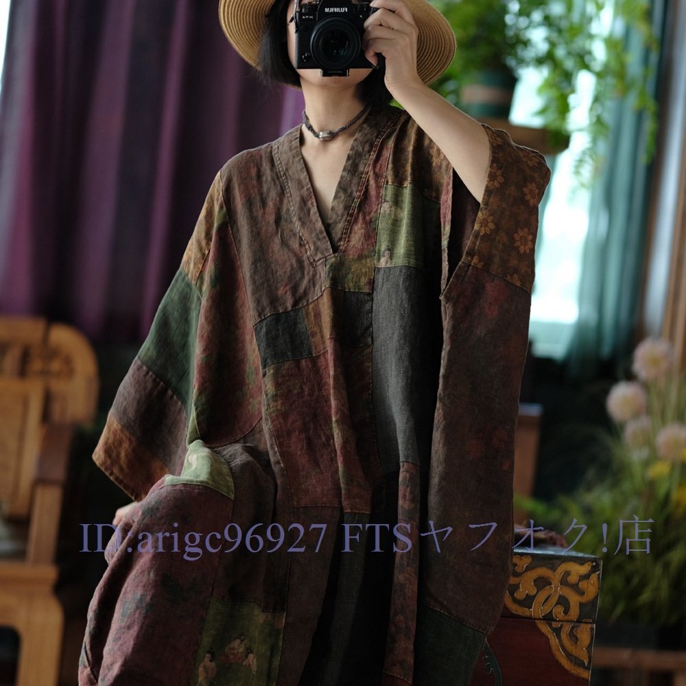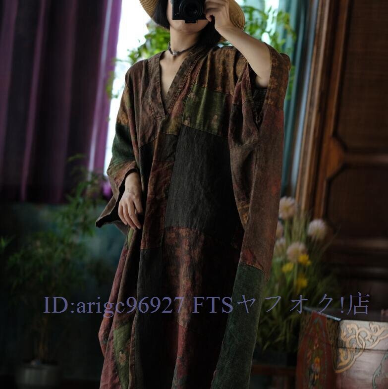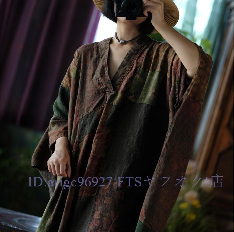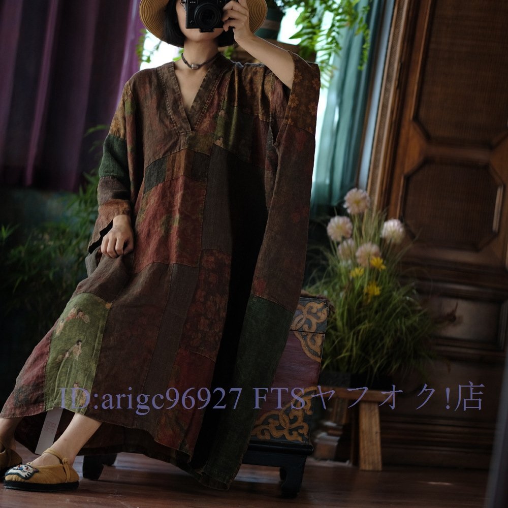 B3606☆新品春ワンピース Vネック 縫い合わせ パッチワーク風 アンティーク風 ロマンファッション リネン RINEN 麻100% ゆったり