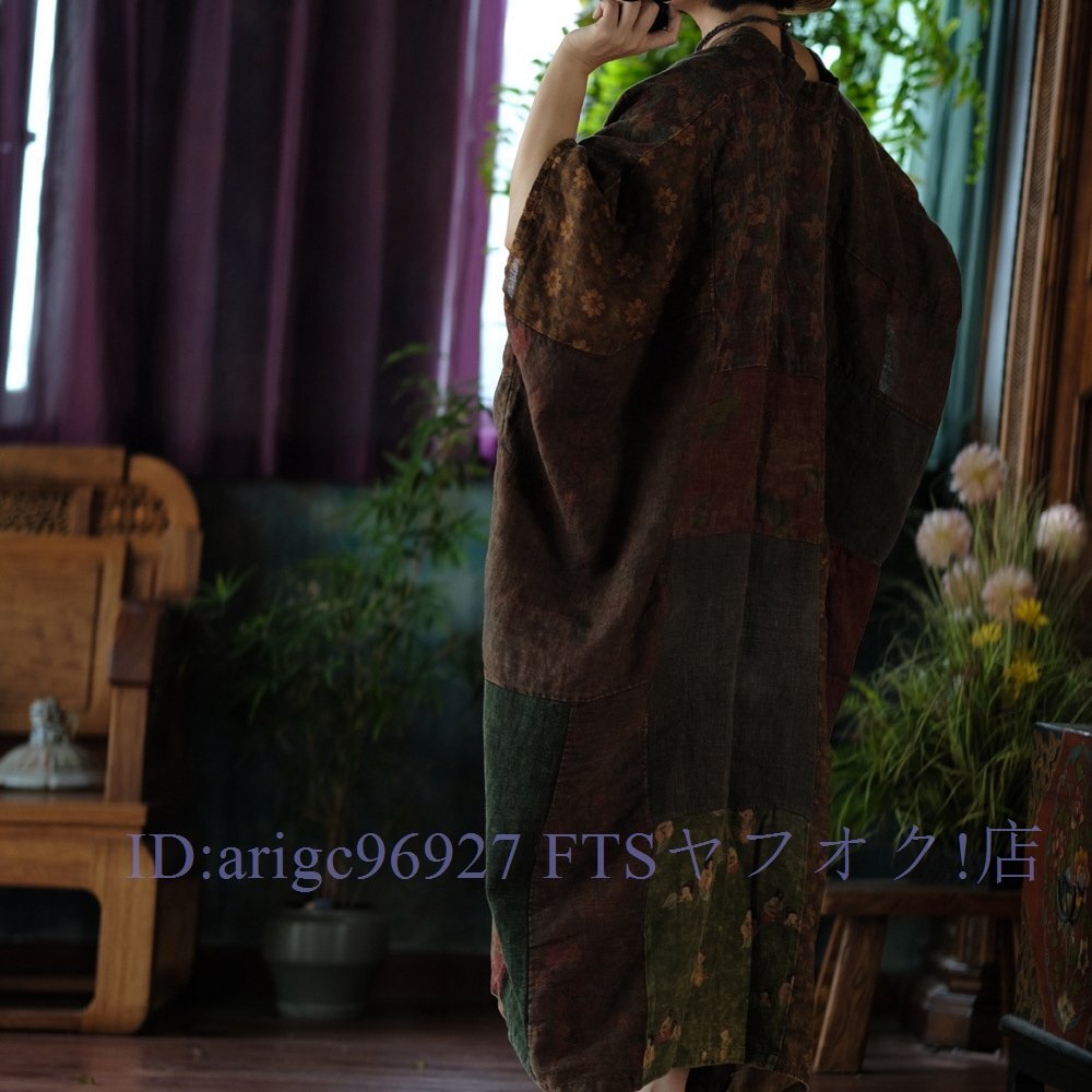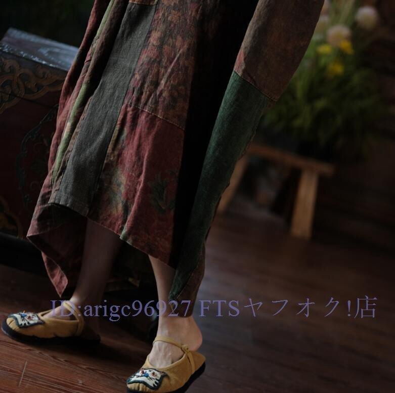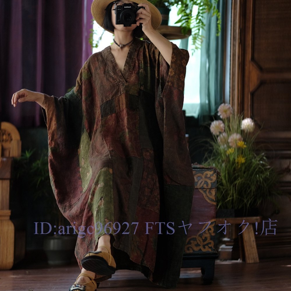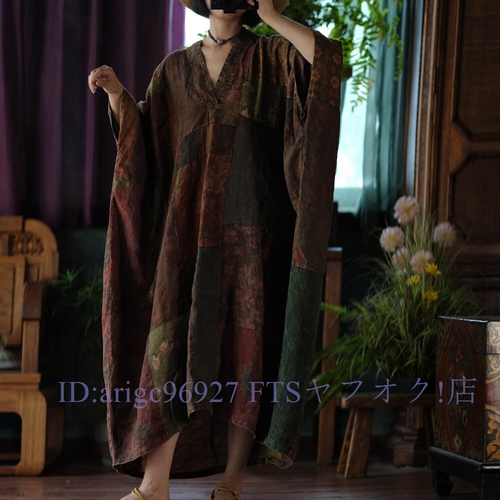B3606☆新品春ワンピース Vネック 縫い合わせ パッチワーク風 アンティーク風 ロマンファッション リネン RINEN 麻100% ゆったり